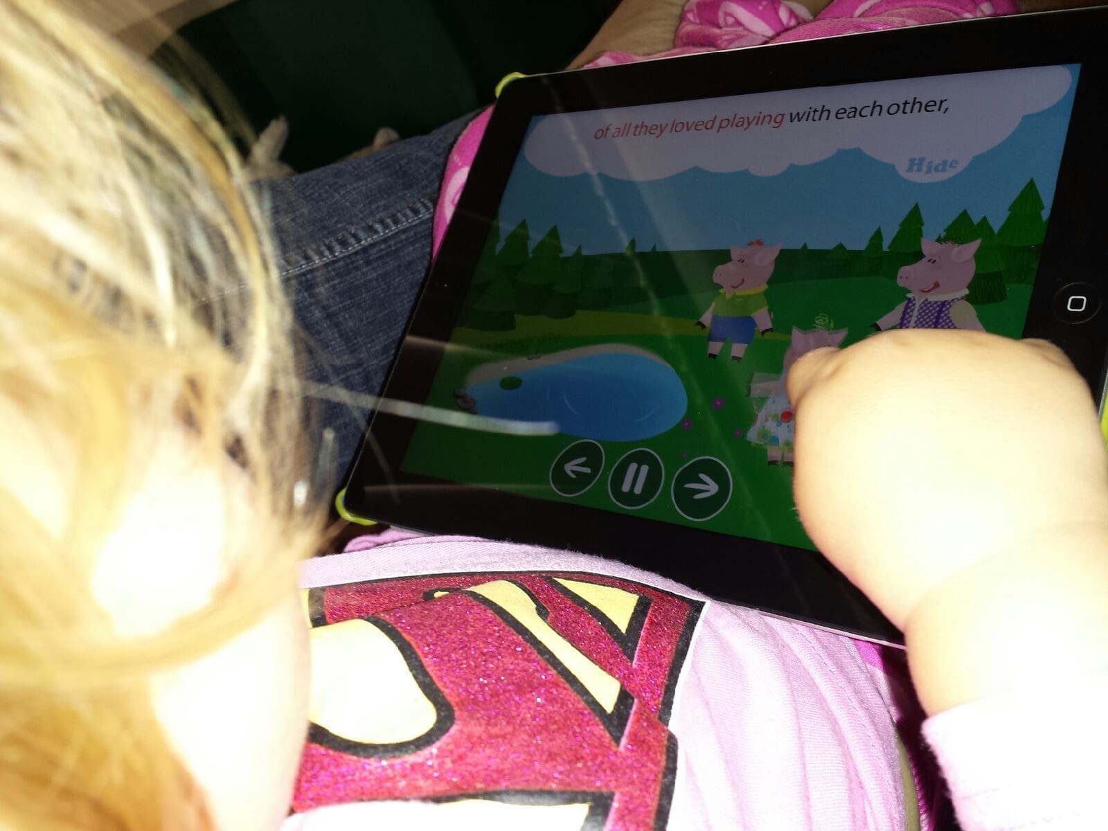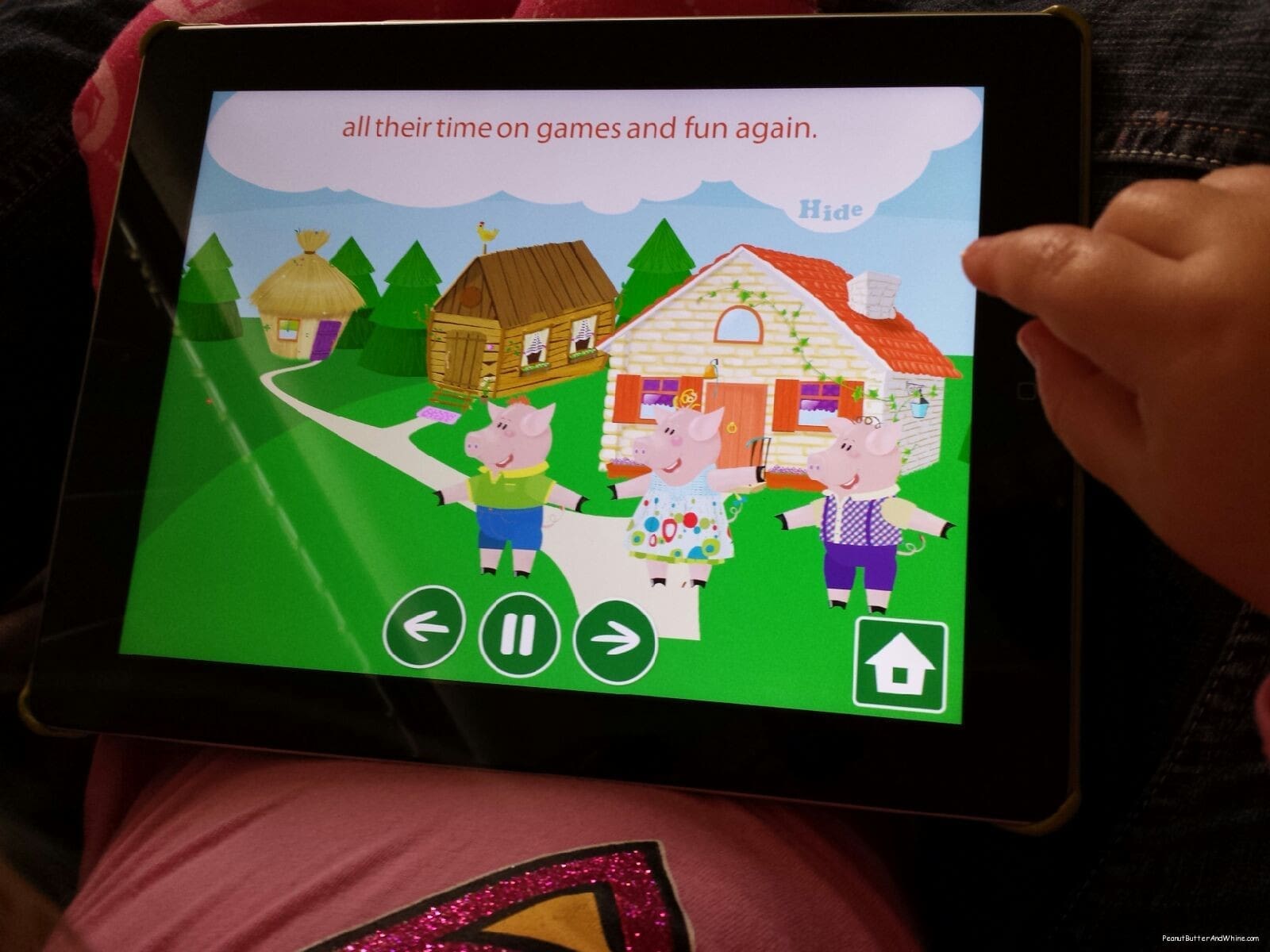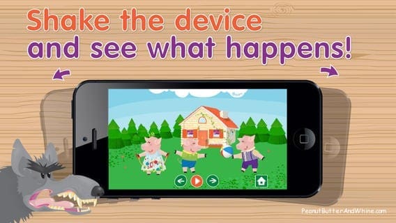 You can put the app on Listen & Play where the story is read to you. Alice can move the little pigs around and play with other items on the screen. CUTE!!!! Alice (you know the sick one on my lap all day!) laughed and smiled moving the 3 pigs around and hearing the funny sound effects.