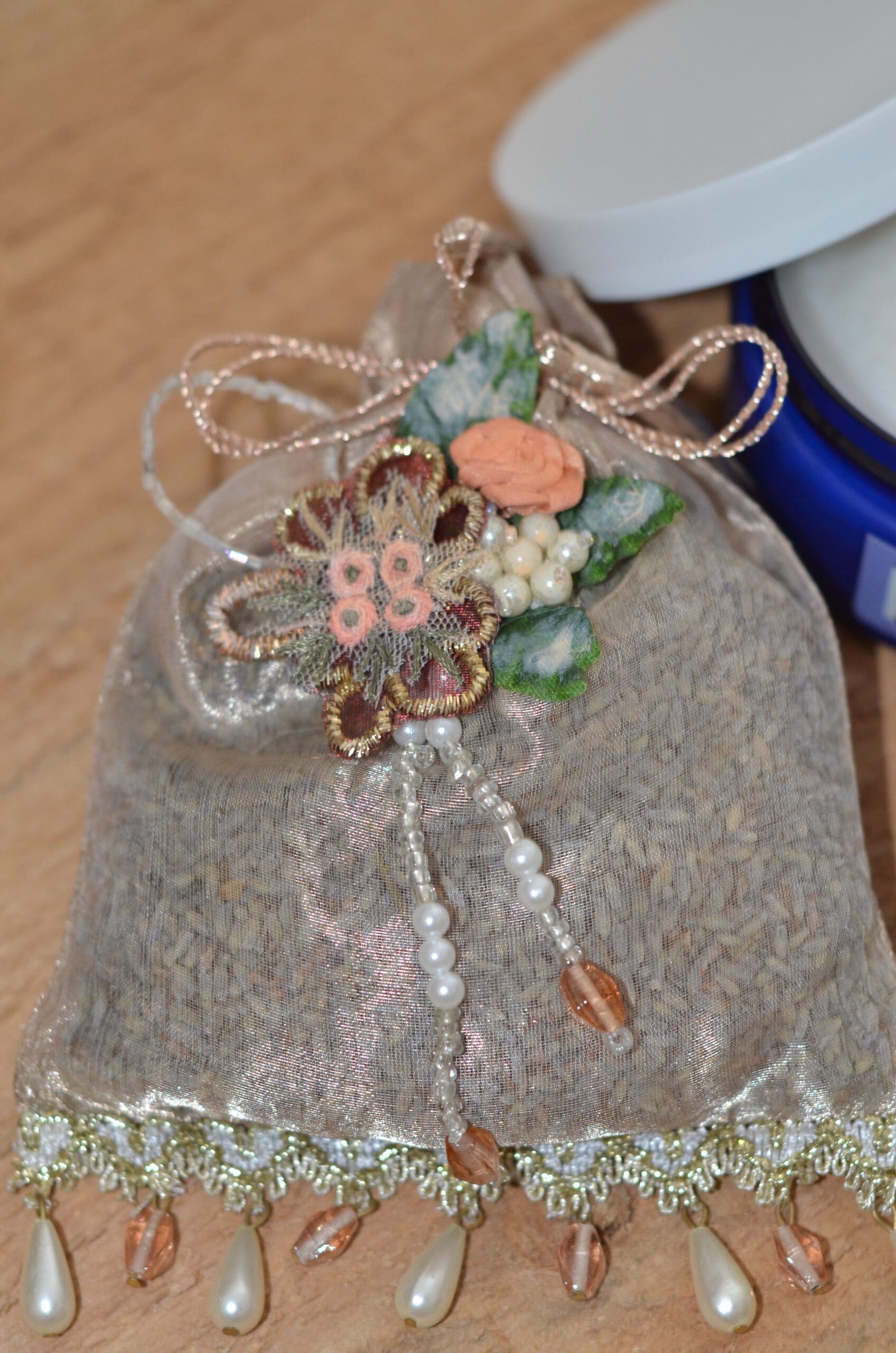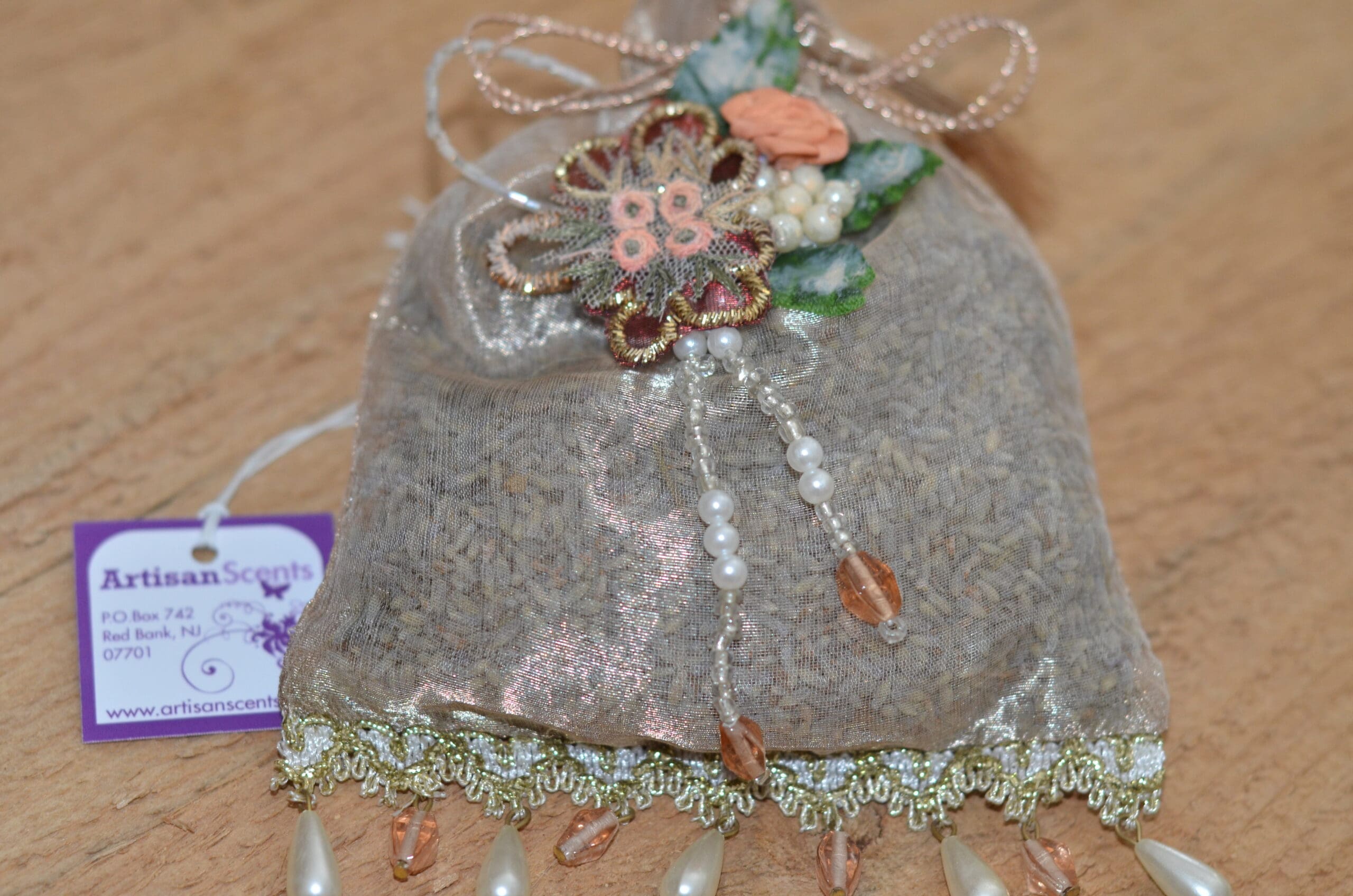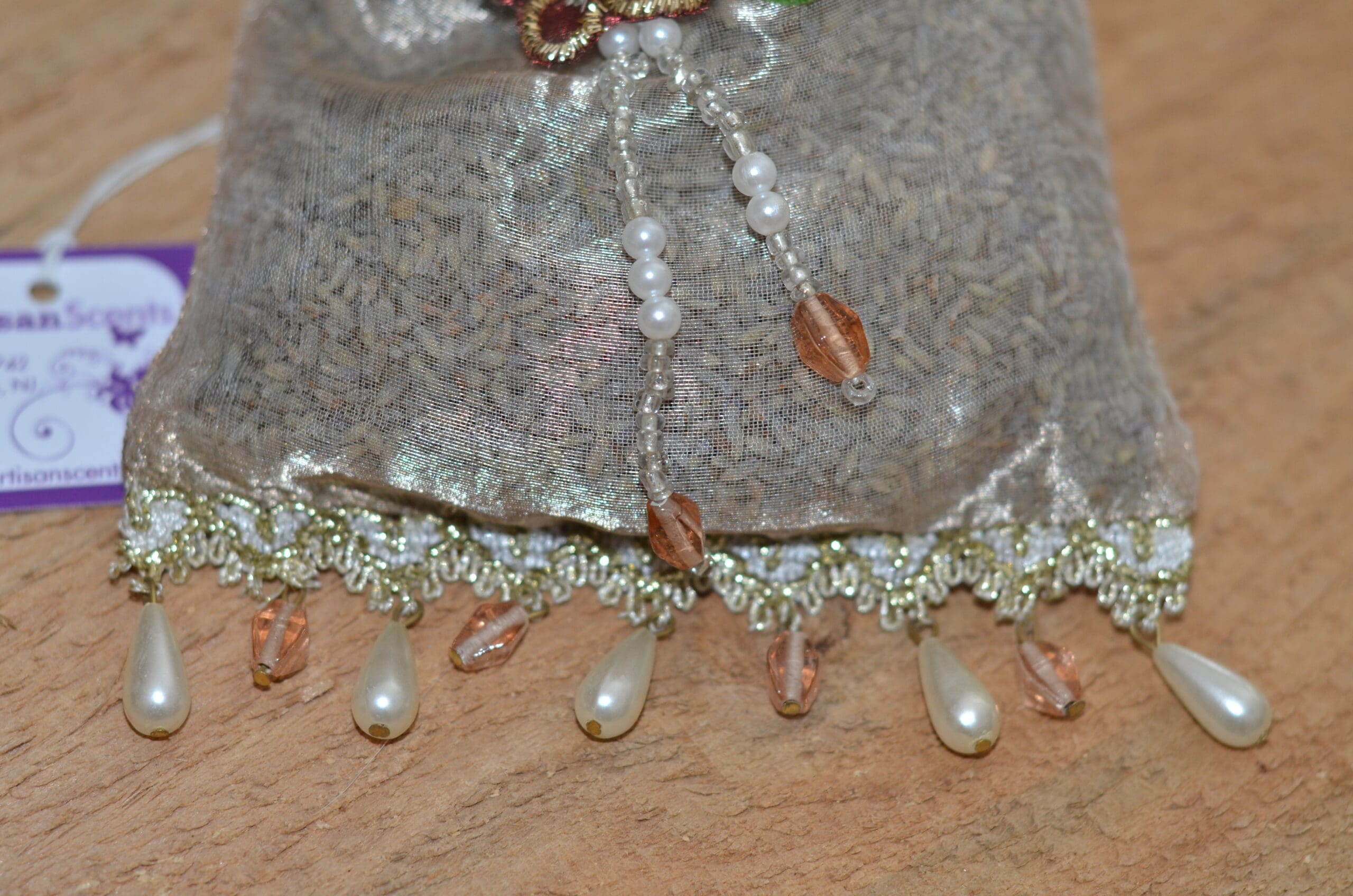 This Victorian Beaded Lavender Sachet not only smells perfect, it looks perfect! It’s beautiful! From top to bottom beautiful!! The bag is made of a soft organza bag that is about 5″ wide and 7.5″ tall. There is an embroidered flower, satin rose and and pearls at the neck. Tied with a gold ribbon and beads hanging down. The bottom has a ornate gold and silver ribbon with hanging beads. The overall effect smells beautiful and looks breathtaking!