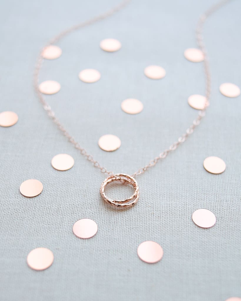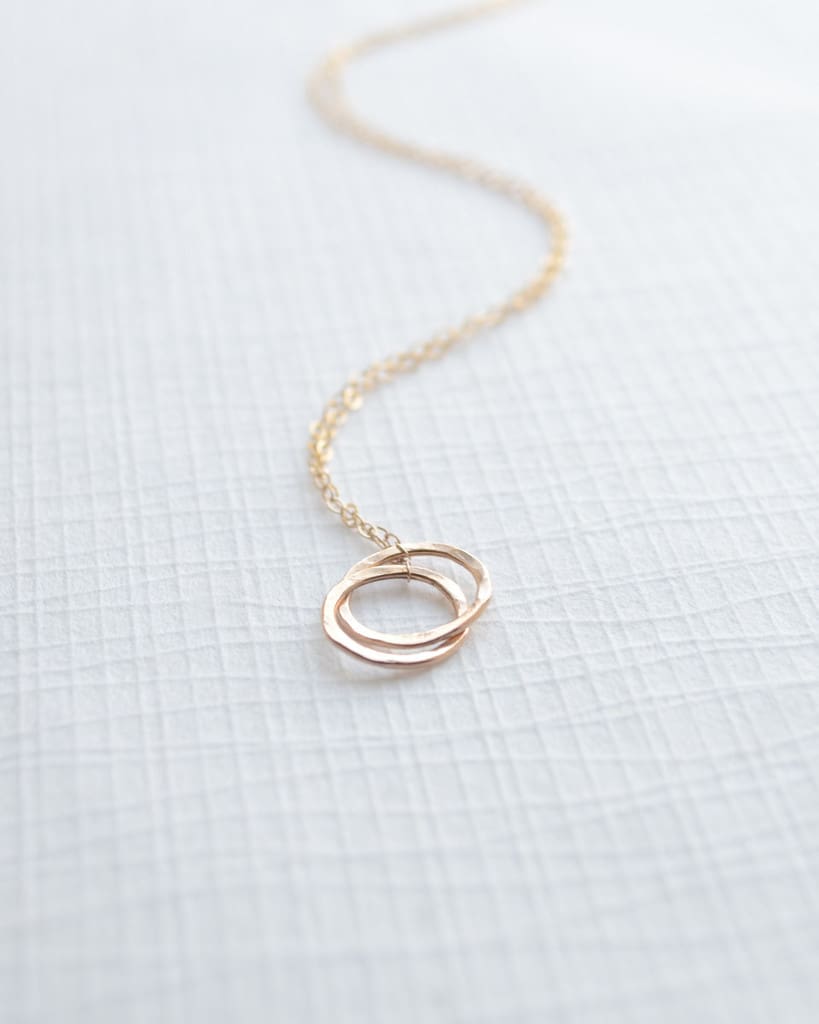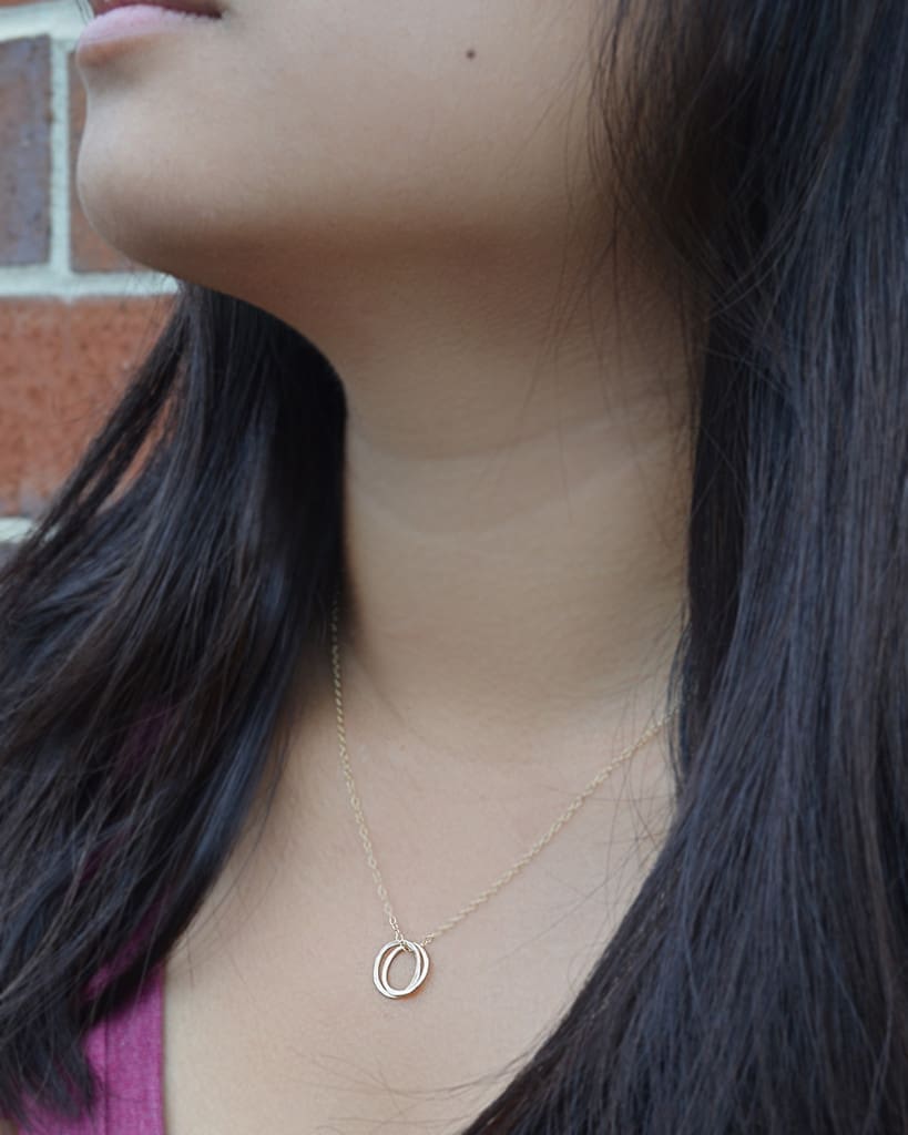 The necklace is on a delicate chain with charms that are intertwined circles; just like best friends. The charms come in 14k rose gold, 14k gold-plated and sterling silver. The necklace comes as a standard 17″ chain. Special lengths are available. Chains also come in 14k rose gold, 14k gold-plated and sterling silver.