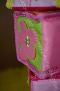 The felt flower is stitched on and the entire block has a great crinkle sound!! The last block has silk taggies stitched into the binding.