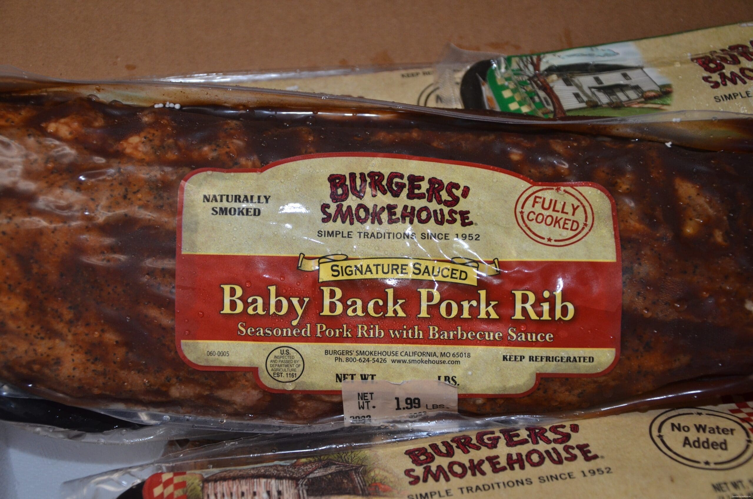 Seriously, an easy and delicious meal!! These are a premier cut of rib!  The Baby Back pork ribs are specially selected, hand spiced, sauced and cooked under the close supervision of their Smokemaster. Finished slabs weigh 1.75 to 2.75 lbs. and are individually vacuum sealed. They’ve done all the work so all that’s left for you is heat and serve.  We heated our Burgers’ Smokehouse ribs in an oven bag and they came out SO TENDER!!!!