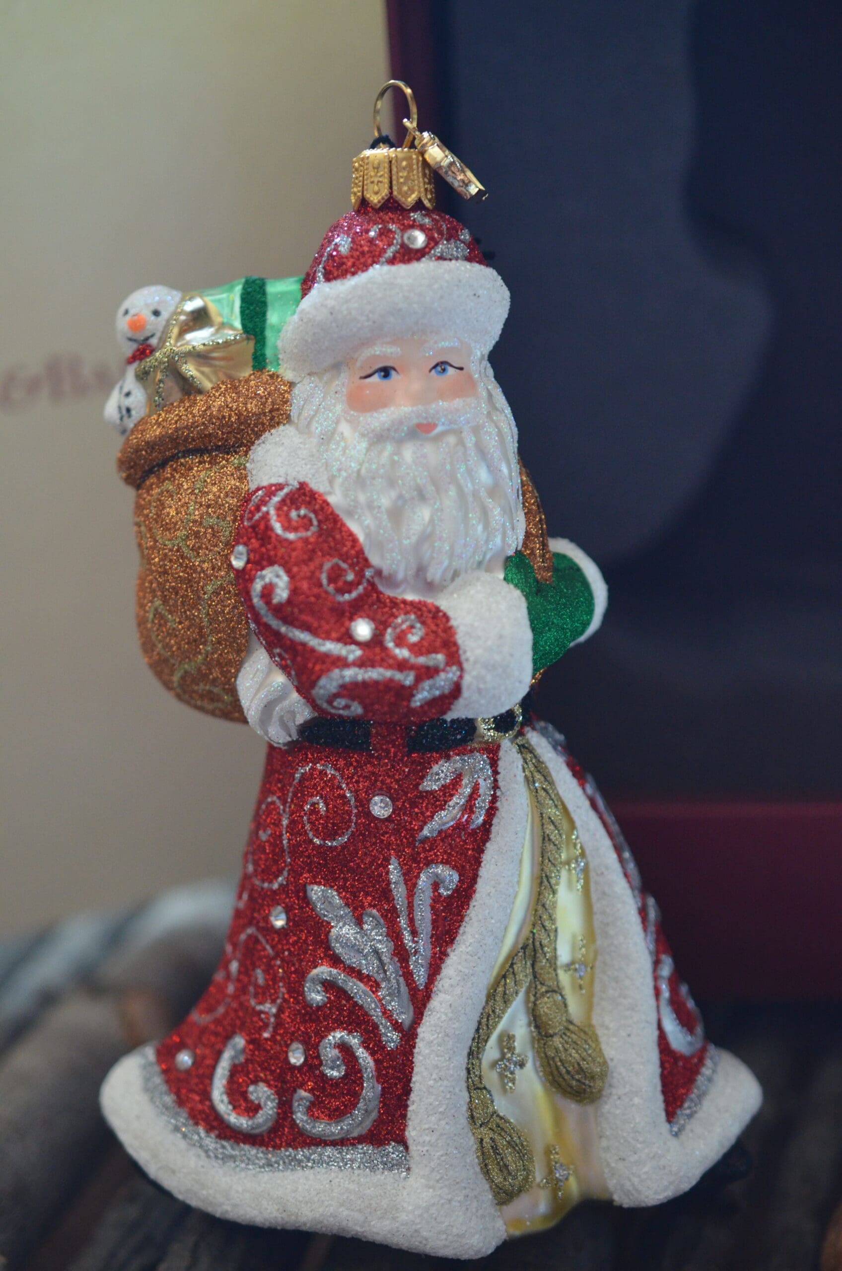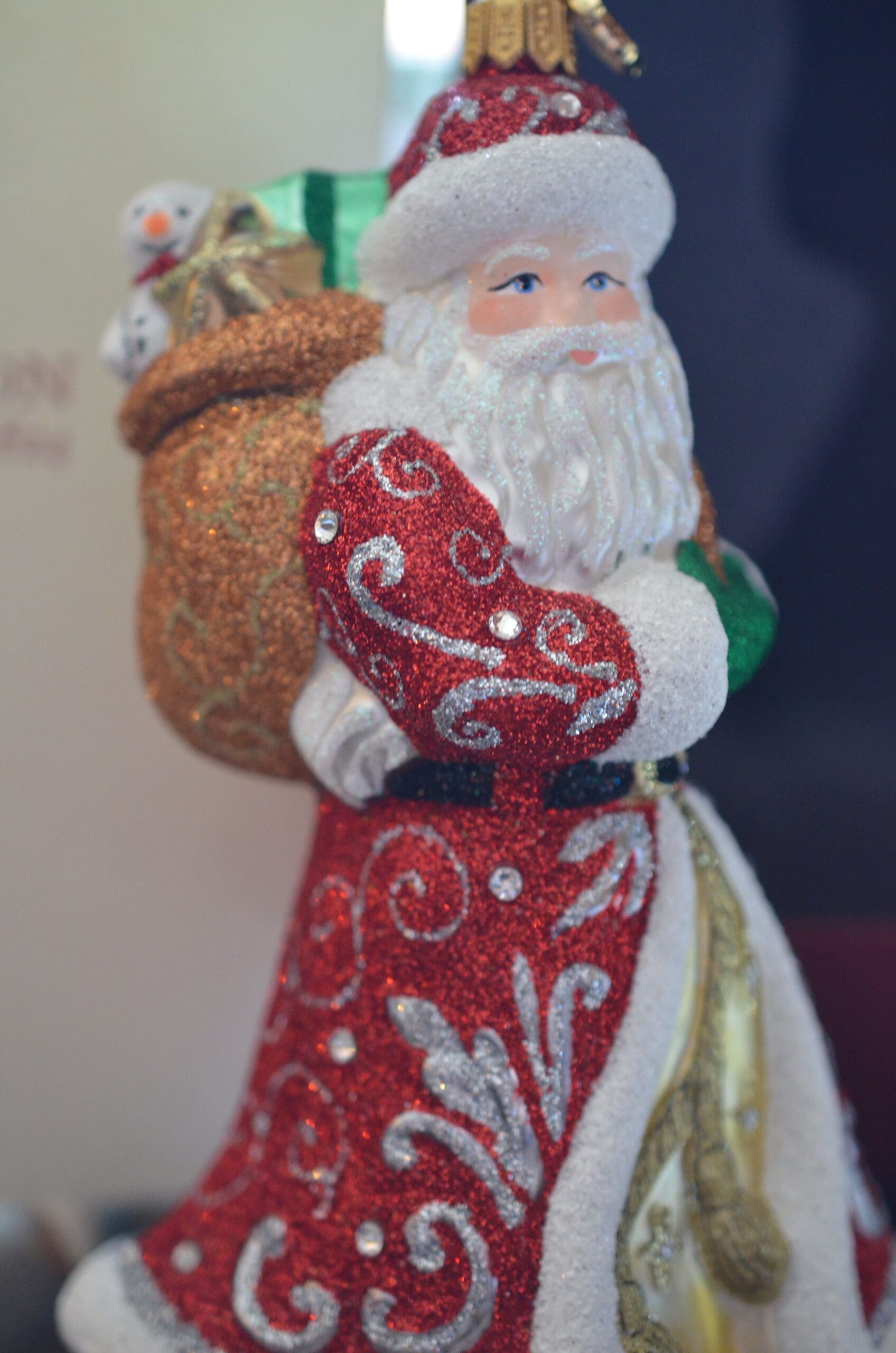 The Christmas ornament we choose for our 2014 tree is from the Christmas Glass Ornament section and it’s called the Christmas Eve Santa. I am blown away at the intricate details on this large Santa. Christmas Eve Santa is an annual ornament present by Reed and Barton with exquisite details!! This ornament will be the focal point of our tree for years to come!! This ornament is perfection!! Accented with glitter and sparkling SWAROVSKI ELEMENTS and accent. Santa’s ruby robe and cap, glitter with silver swirls. Santa appears to be in mid stride with a sack full of treasures swung over his shoulder. The bag even looks like a rich gold and maroon brocade.