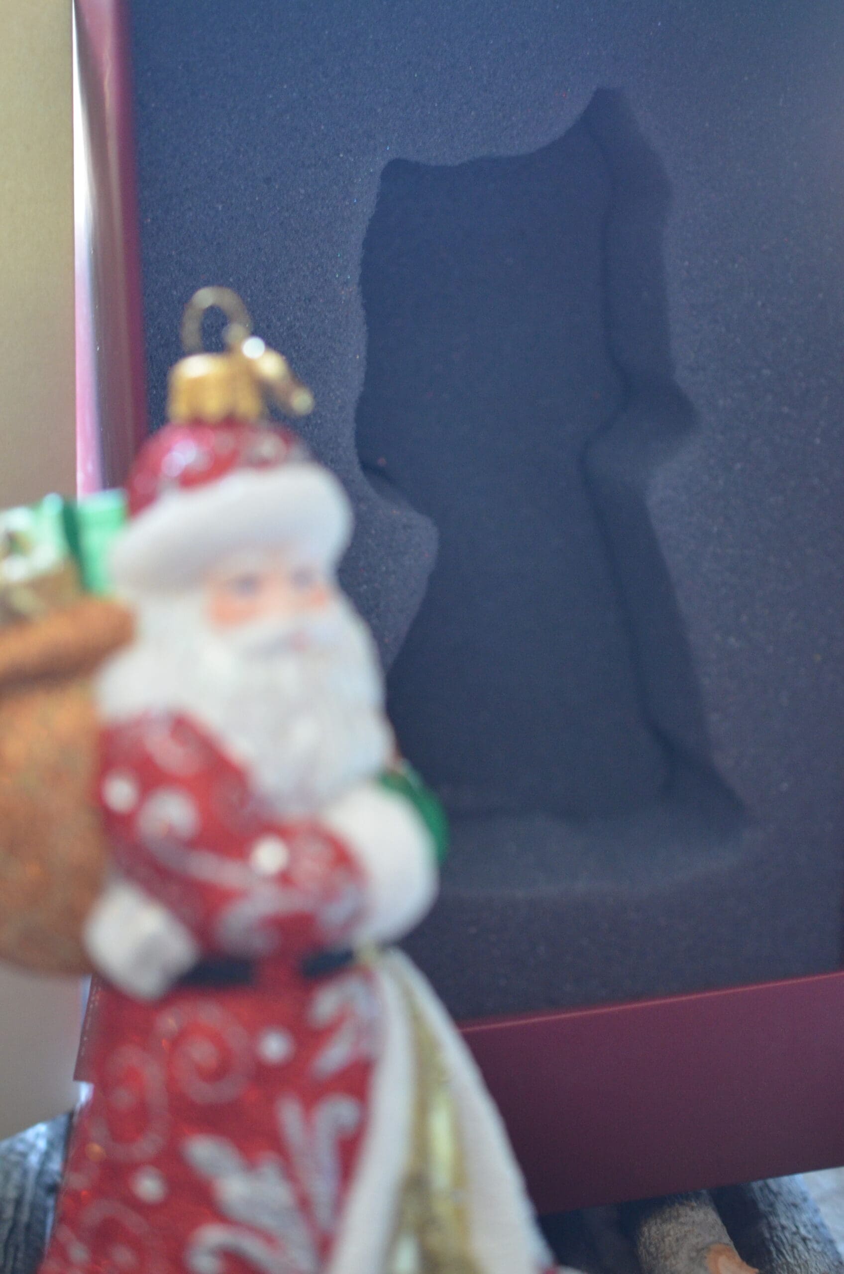 Our Christmas Glass Ornament arrived in an elegant package with Reed and Barton engraved in silver, on the front of the deep red box. STUNNING presentation. Inside Santa is nestled in foam that is the exact cutout shape. Santa fits inside perfectly. This box will ensure that Santa will be on our tree every single year from here on!!!