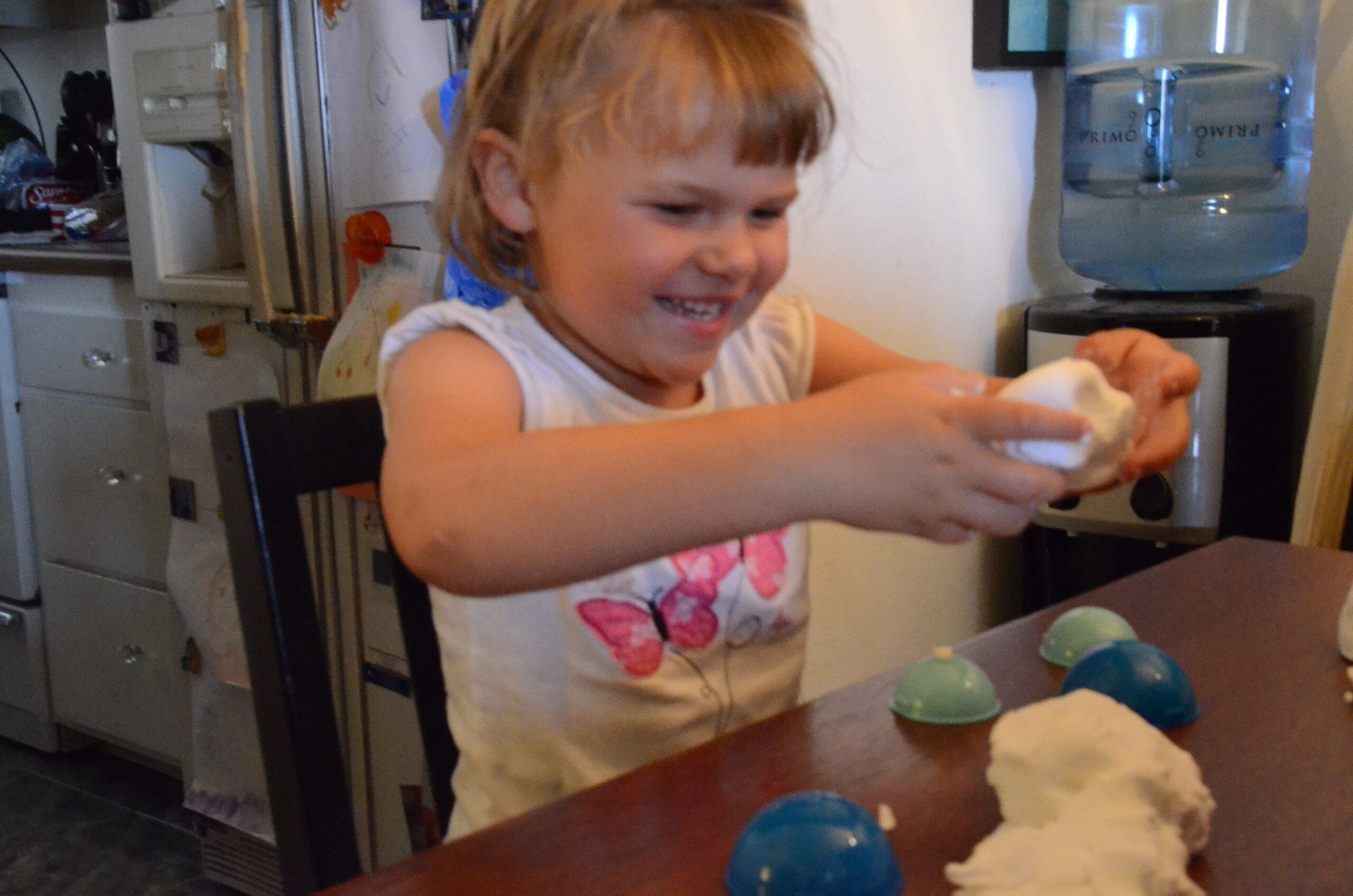 Floof arrives in a bucket with an airtight lid that keeps it’s soft and moldable. Floof arrives with 2 round molds so you can make snowmen or snowballs. Alice doesn’t use the round molds very often, she would rather just smash, mold, fluff and create her own masterpieces.