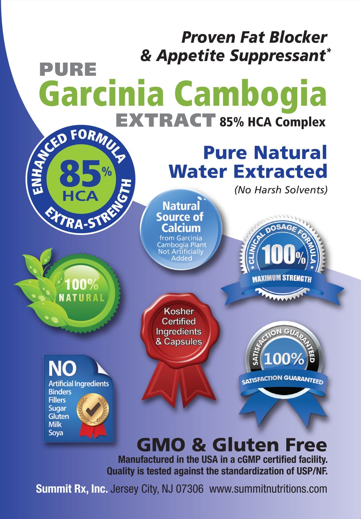 - DOEST IT WORK? – Yes, Summit Nutritions Garcinia Cambogia is 100% Pure and Natural formula which comes in Clinical Strength, which control your appetite, blocks fat, increase serotonin level (Good for people who eat more in stress) and increase the energy level. The ultimate weight loss goal is achieved by only proper use of Diet and Exercise and the goal is boosted by Garcinia Cambogia fat blocking effect as studied in many credible clinical studies.