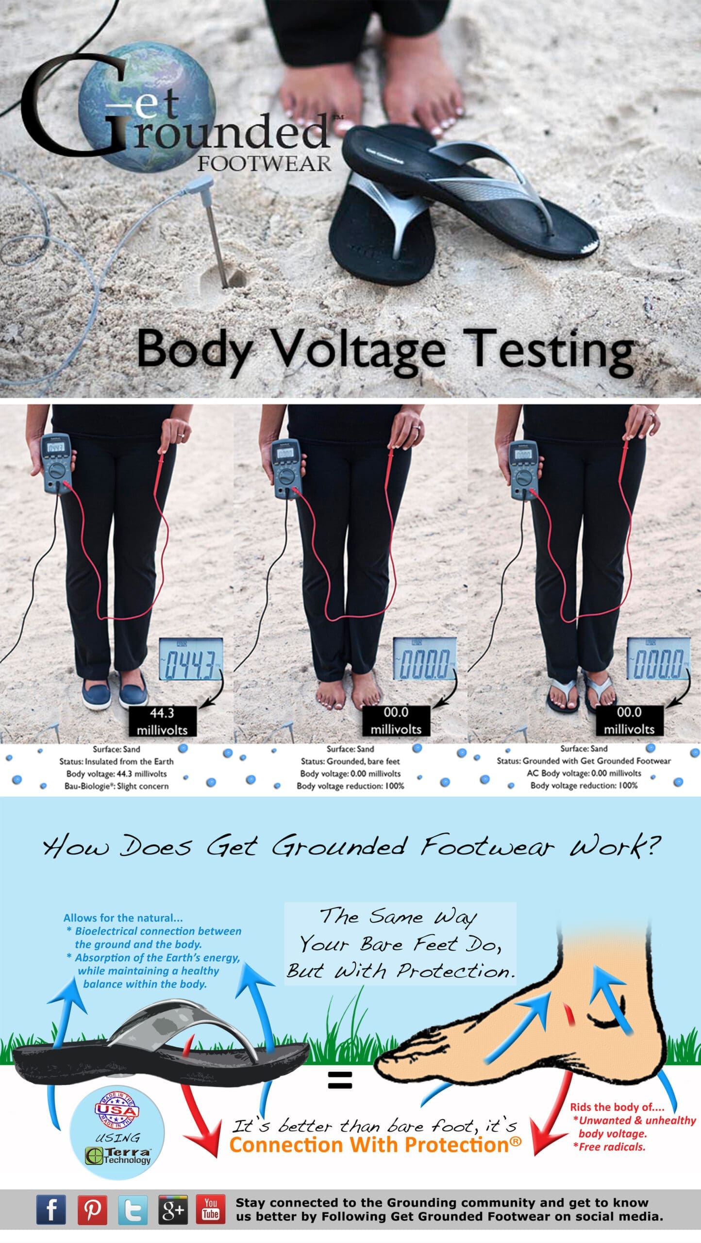 Wearing Get Grounded Footwear™, I am able to absorb a subtle and organic energy in the form of negatively charged free electrons. As an electrical being, this allows you to balance your bioelectrical state and in turn to help you feel better, look better, and have more energy. Get Grounded Footwear™ has a fully Grounded footbed, comprised of there proprietary TerraMater Footwear Material. This means that you get full surface contact between the Earth and the sole of your foot. This allows for continuity and an unlimited supply of Earth’s energy while on any conductive surface. Simply put, it’s a shoe with a purpose.