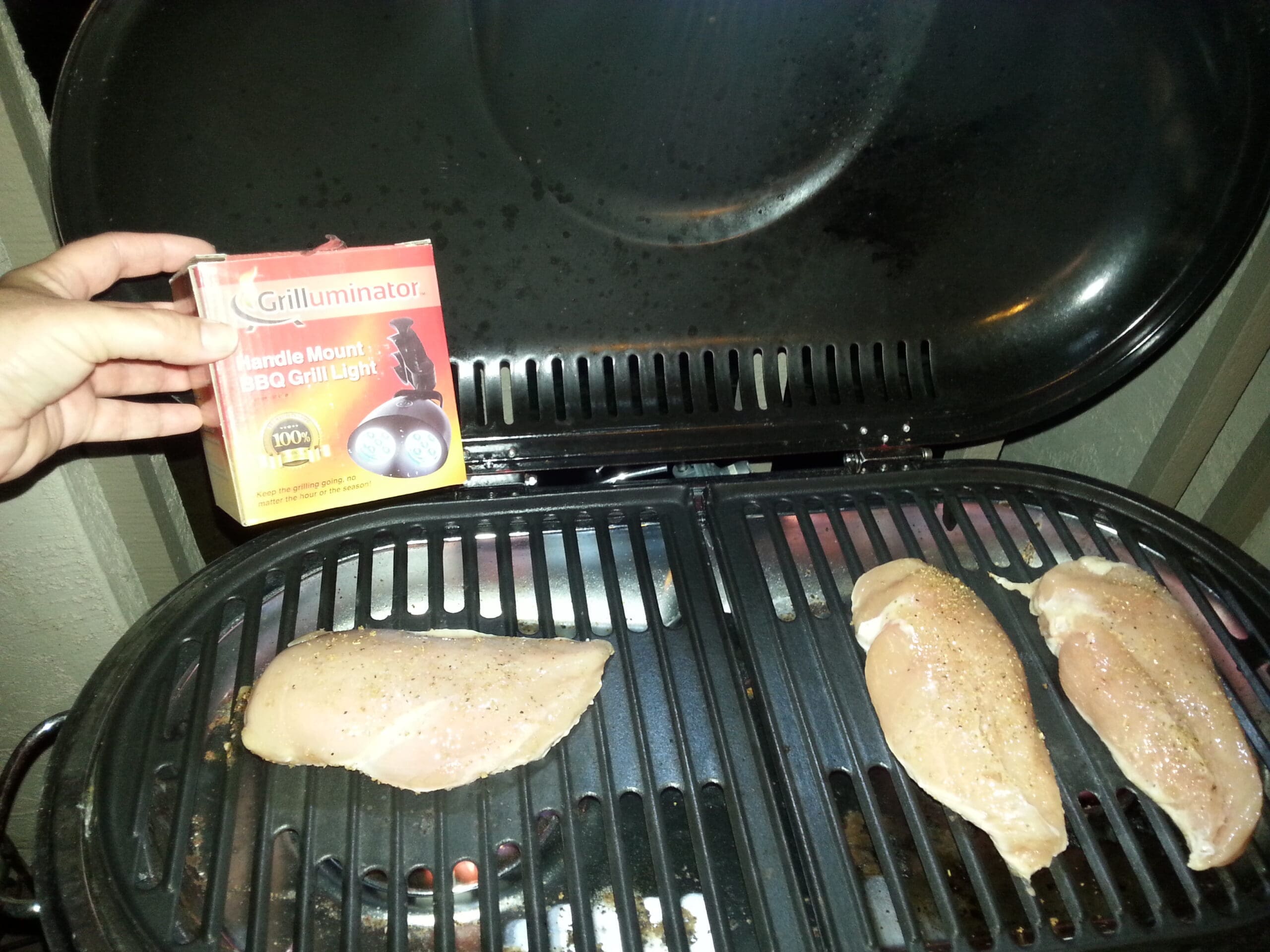 How easy is this light? Step one: Open box. Step 2: Remove light. Step 3: Hook to the grill and…. Wait for it. Step 4: Press on switch.