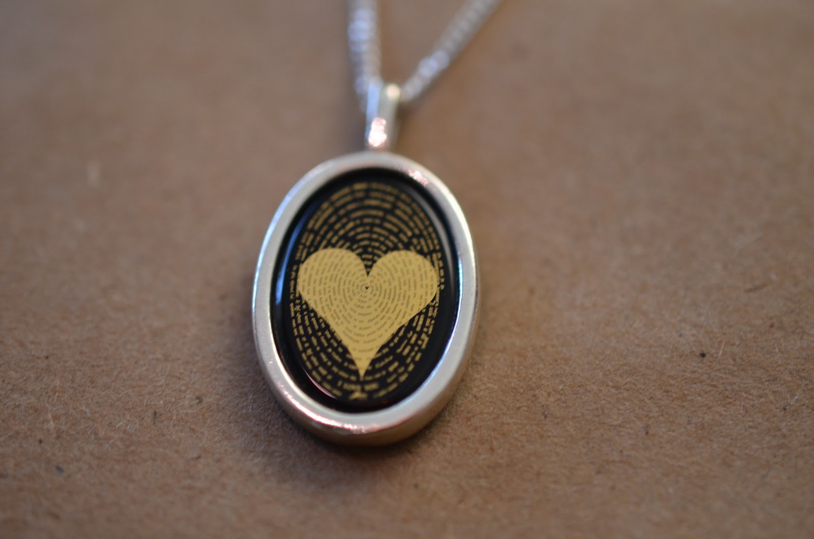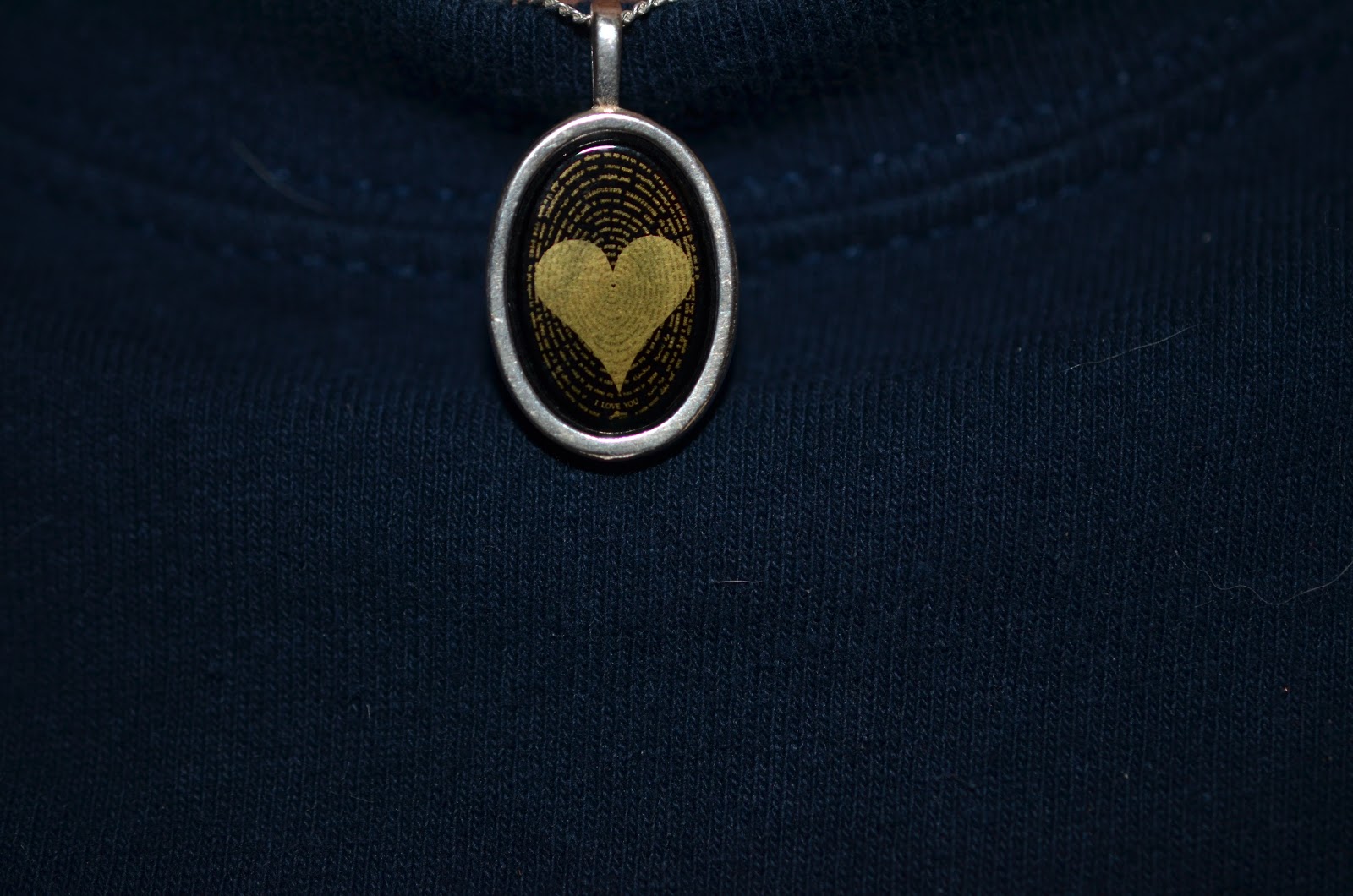 The words “I Love You” are embedded in 24kt gold into the onyx. The black onyx has a gold heart in the center and the words circle around the entire pendant. At first glance I thought it resembled a fingerprint.