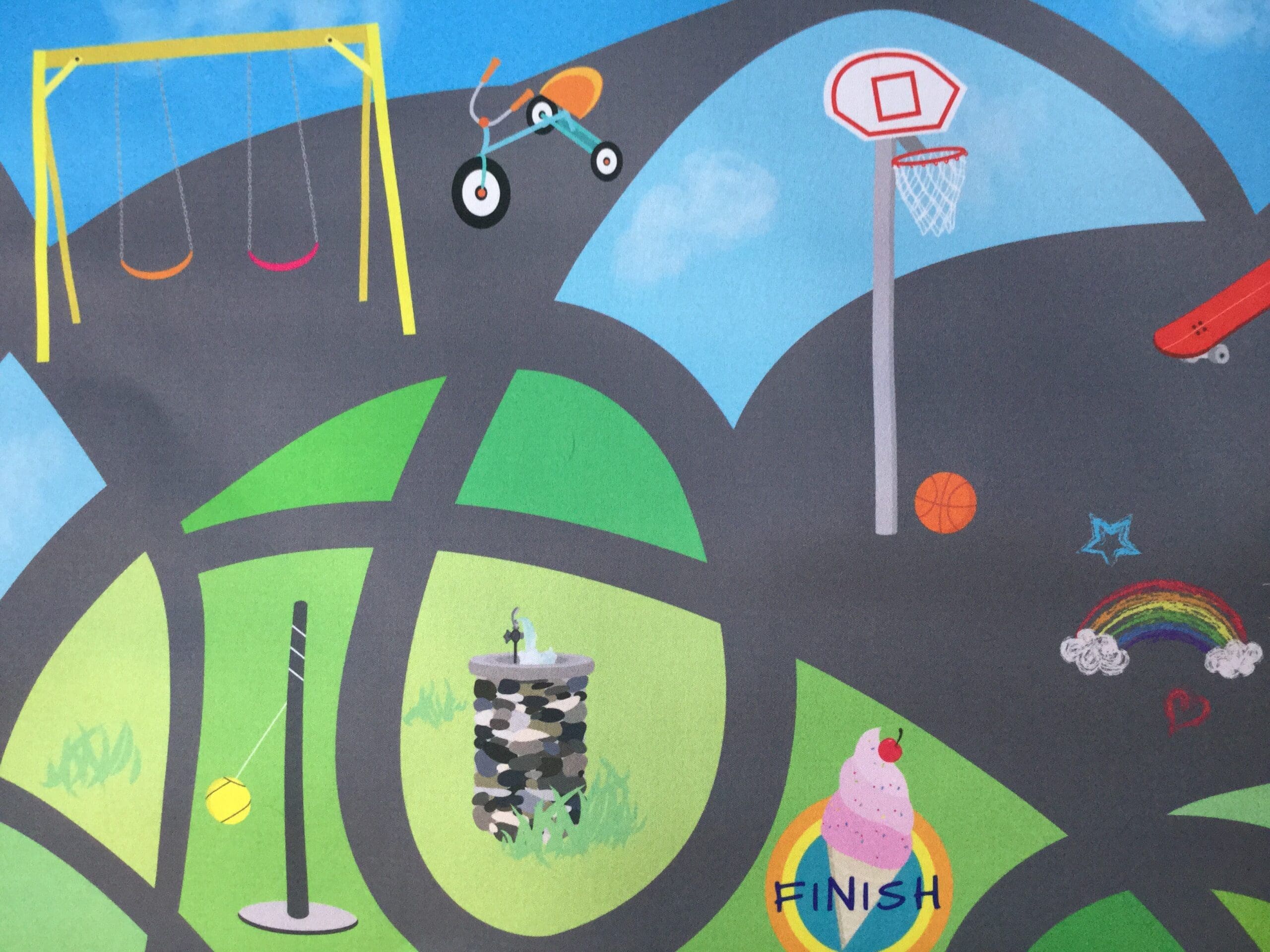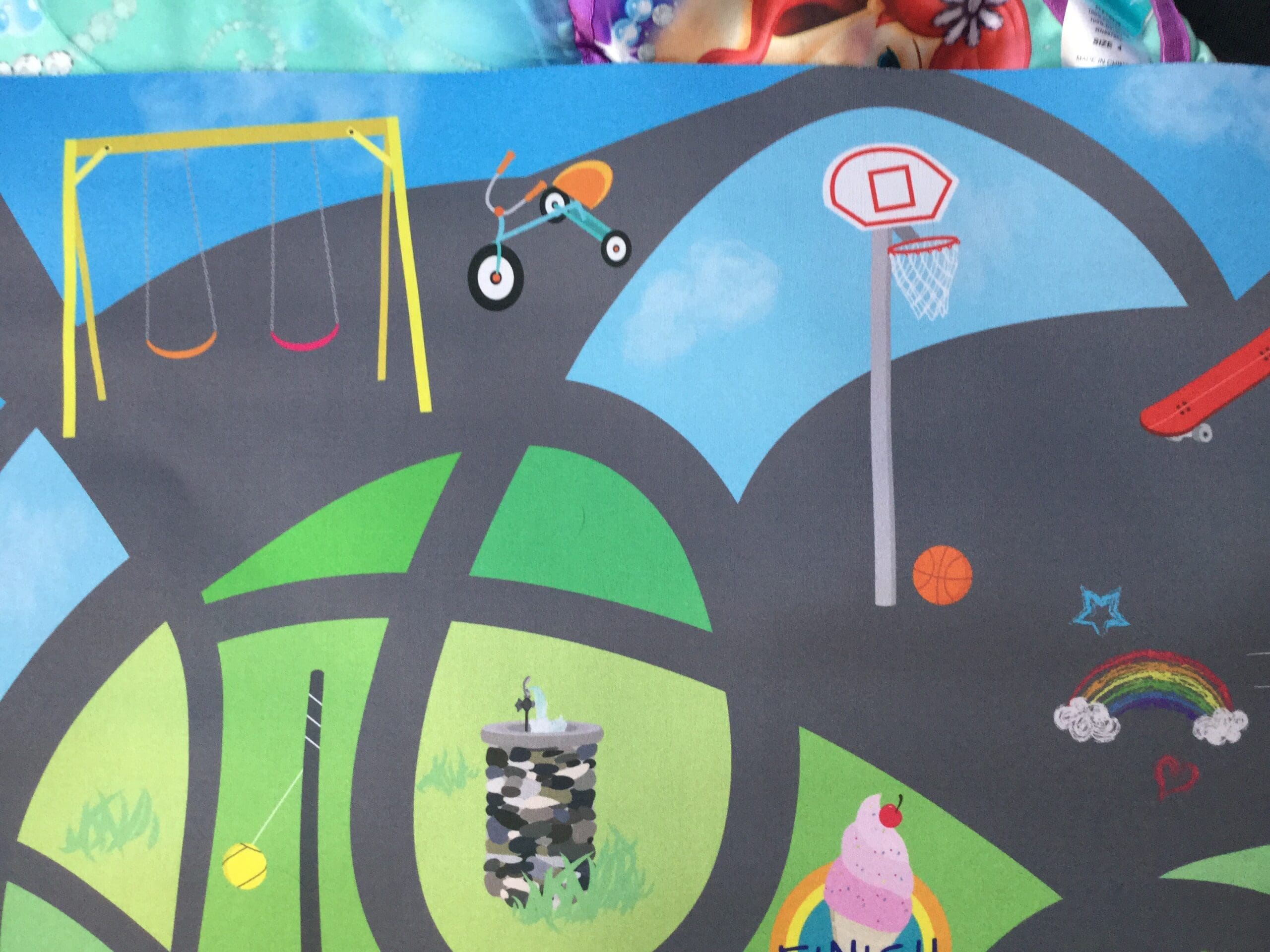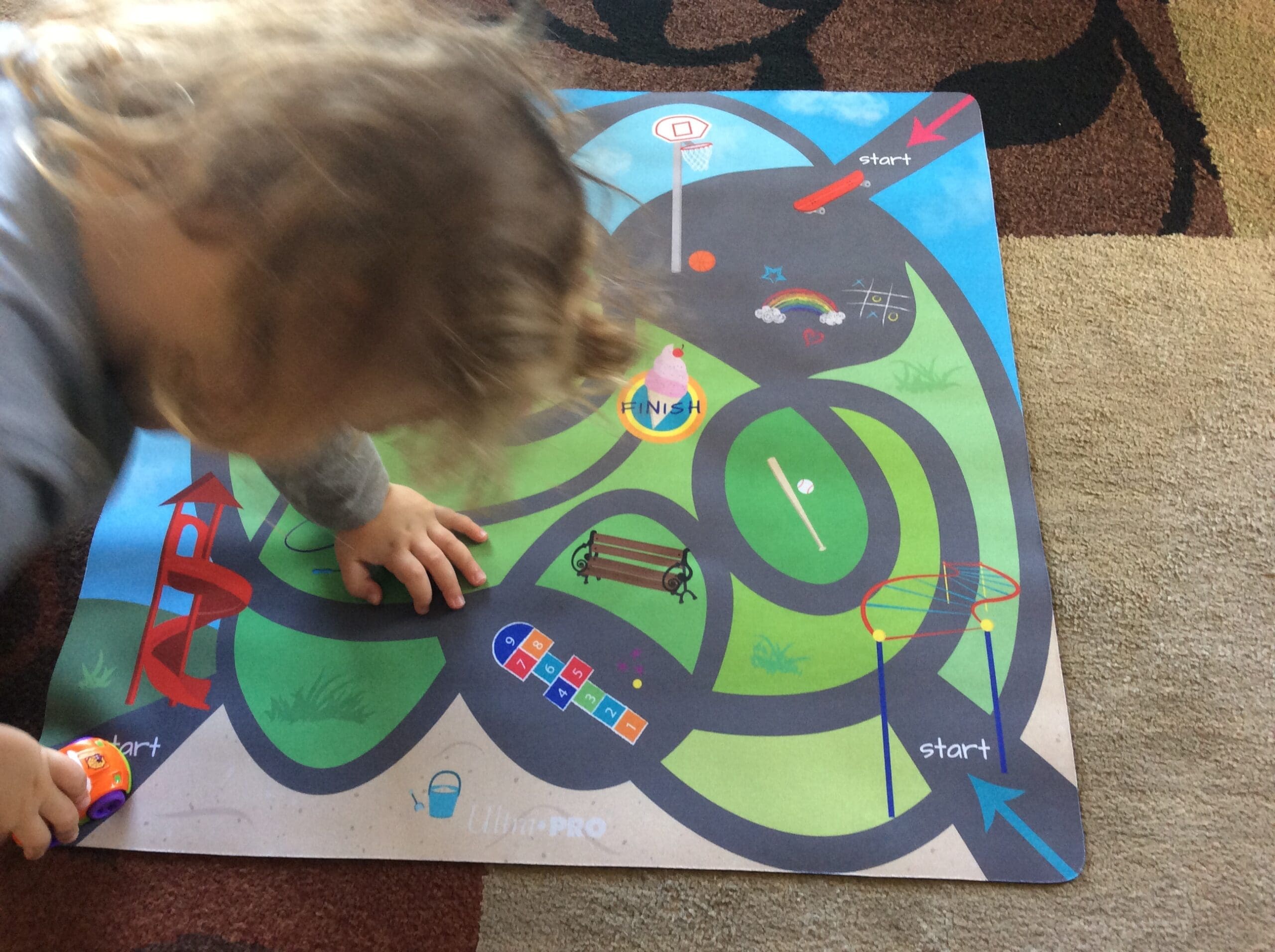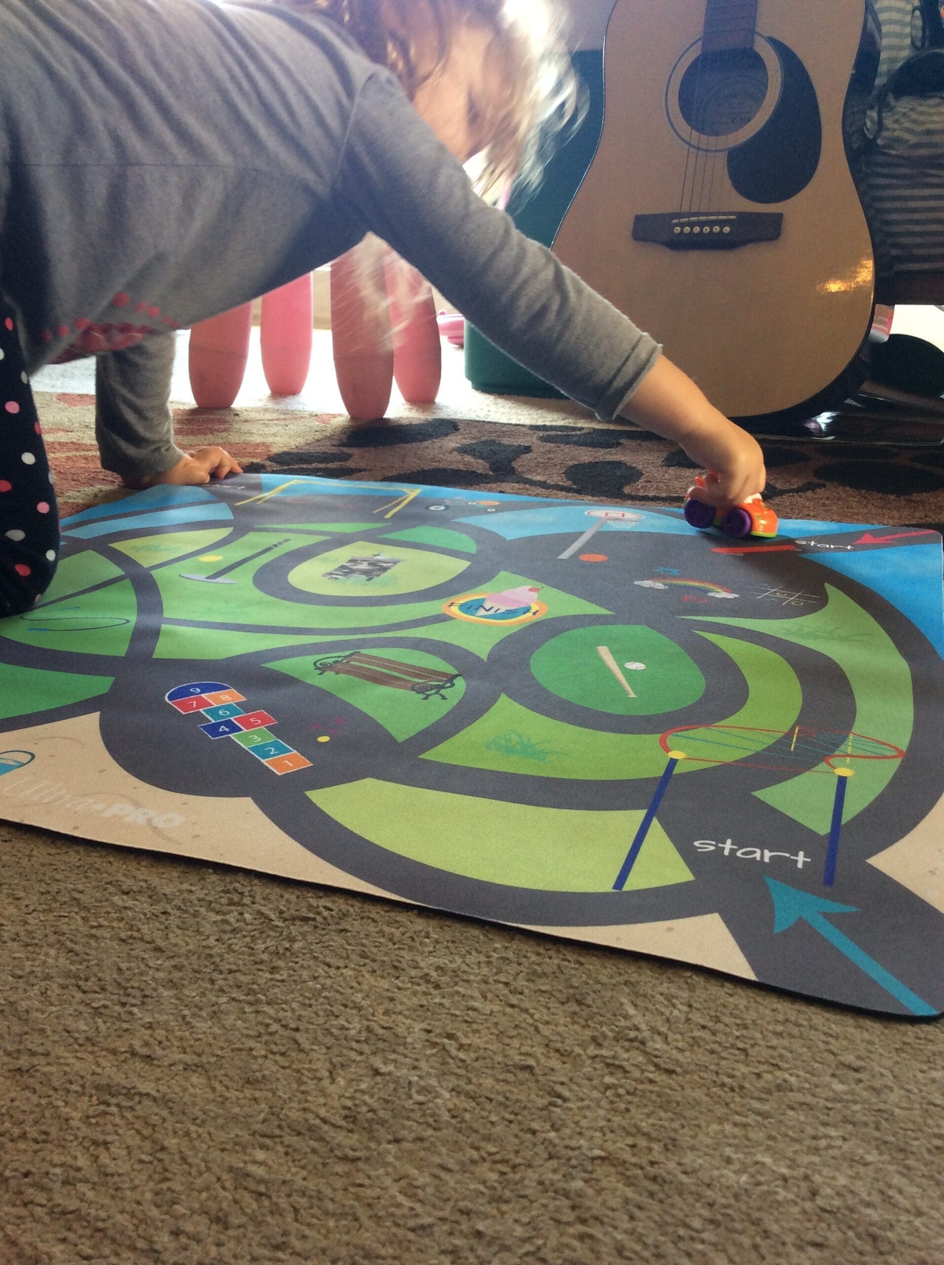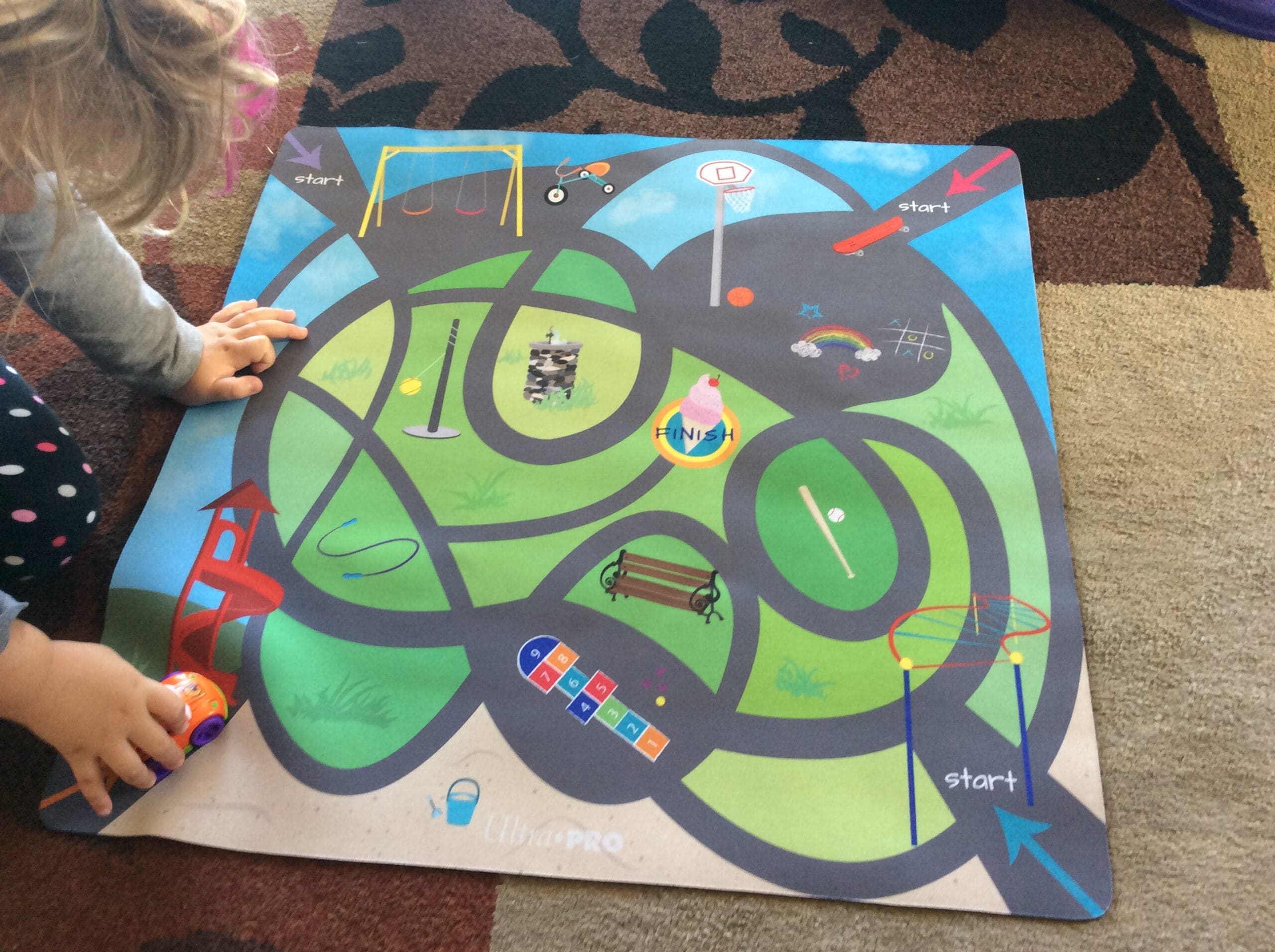 As soon as I pulled the Playground Maze Mat from the box she was in love. She rides cars on the mat. Her “Little People” play on the play ground. She covers the dog with the mat. She takes the mat EVERYWHERE with us!! This mat is a true hit in our house!
