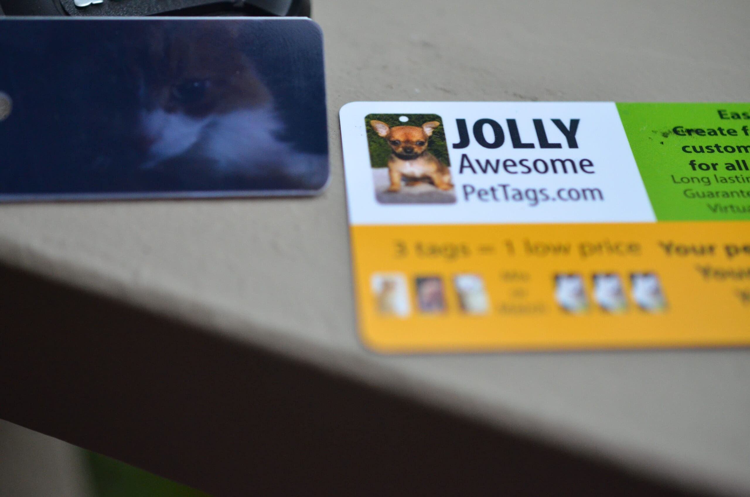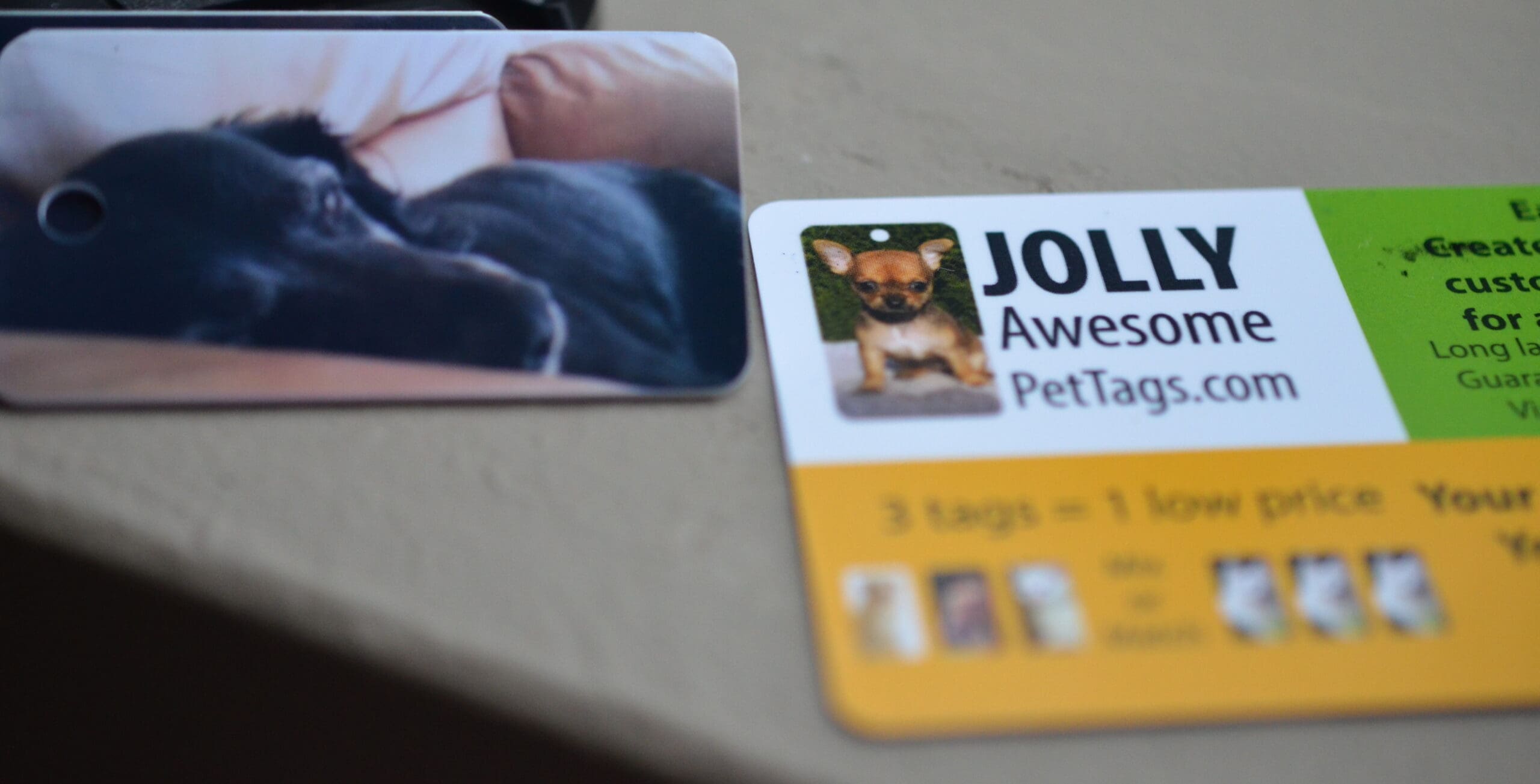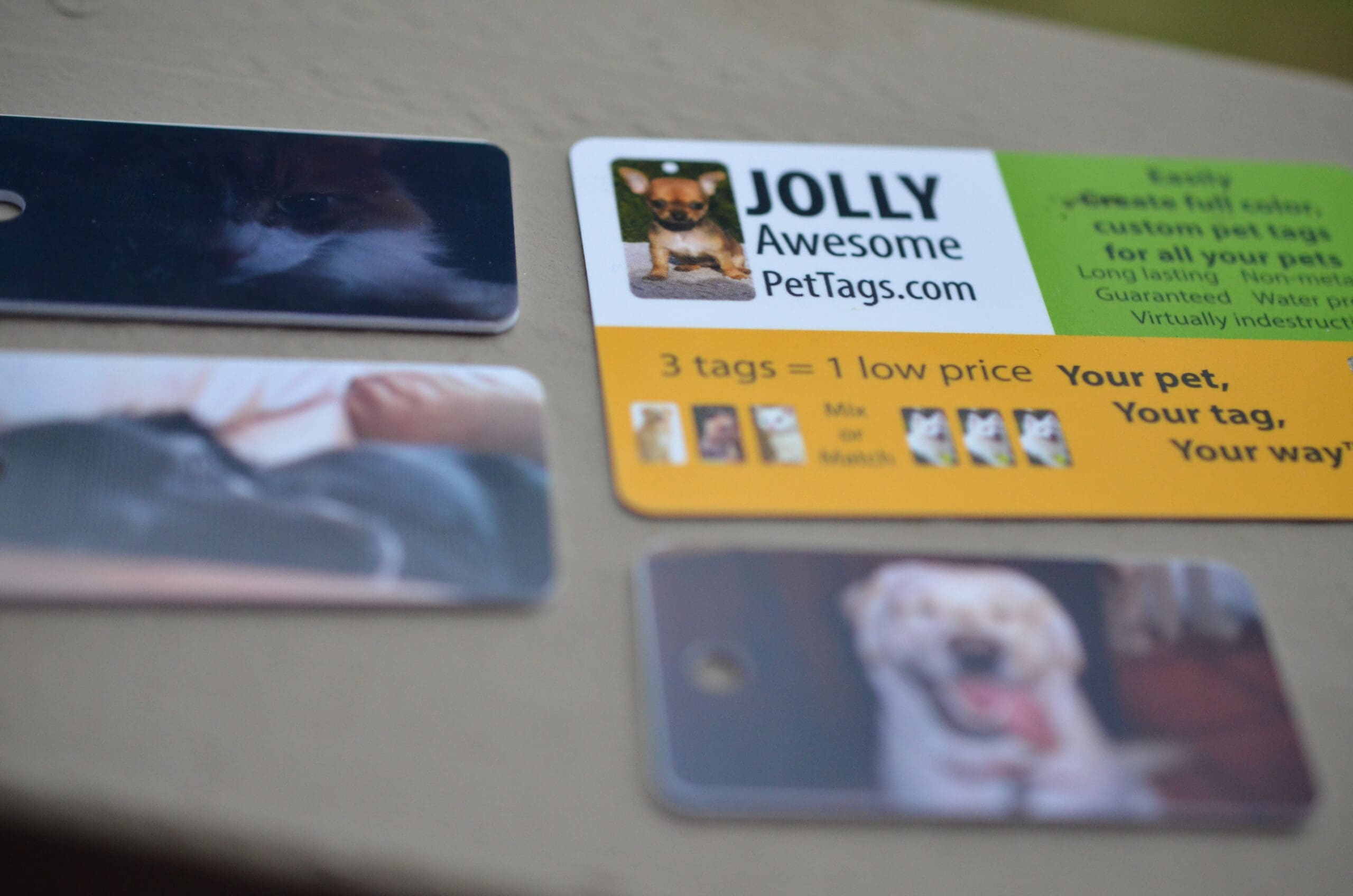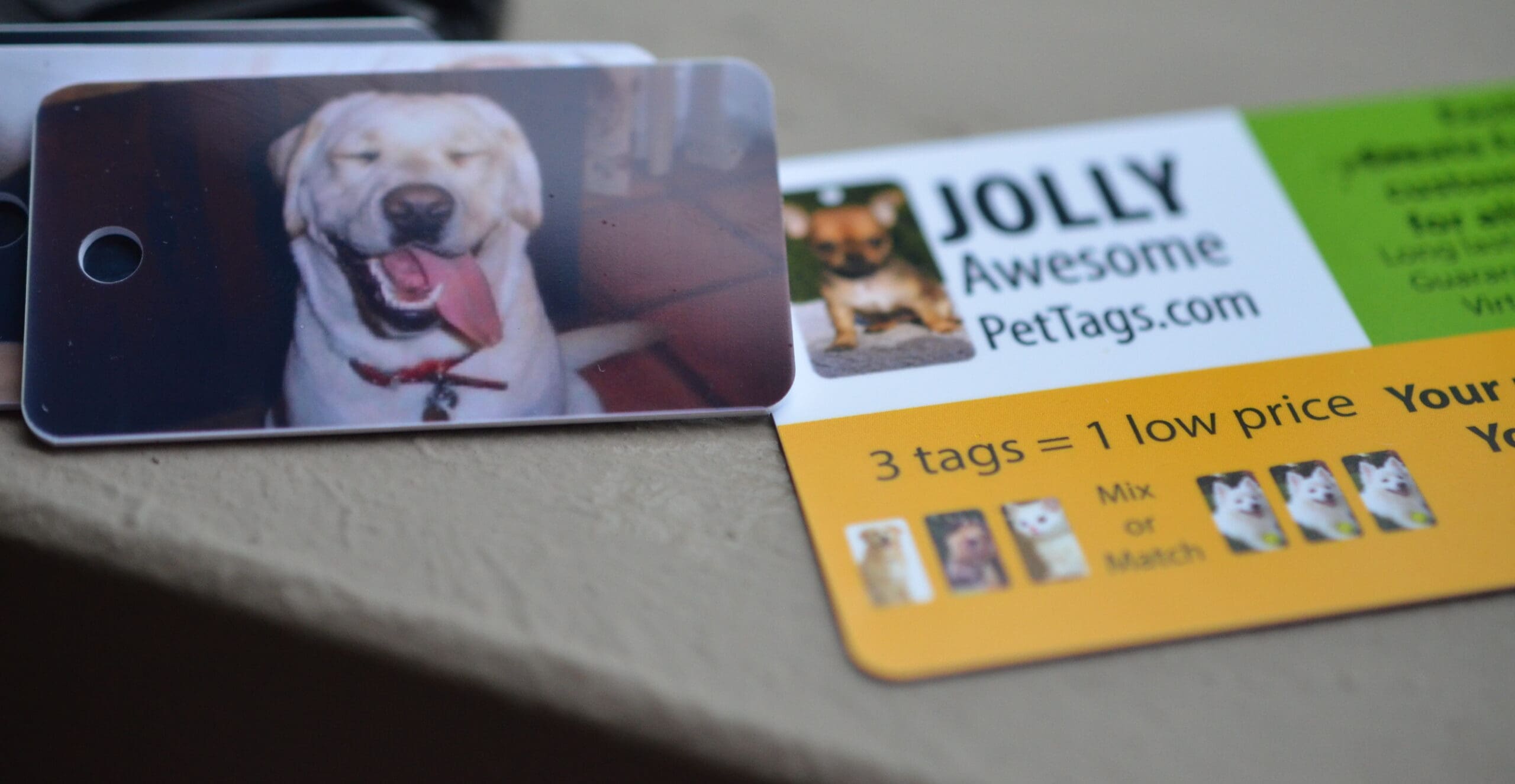Jolly Awesome Pet Tags are made of a thick, non metallic material and are strong and durable. These will not fall apart even in the snow and rain.  BONUS!!! Because they are non-metallic they don’t clink or make any noise. MAN! I love that feature!