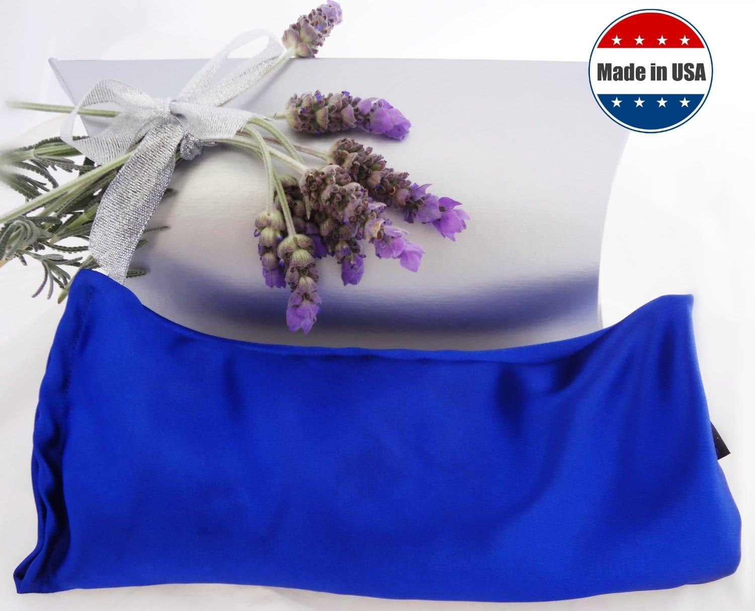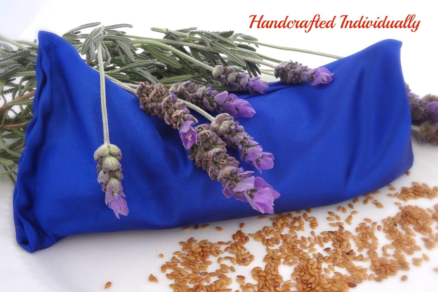 The Karmick Eye Mask is filled with soothing French Lavender and high quality Organic Flax Seeds. The weight is PERFECT!! This stays put on my eyes or forehead. The eye mask is also beautiful to look at! A brilliant royal blue satin. So pretty!!!