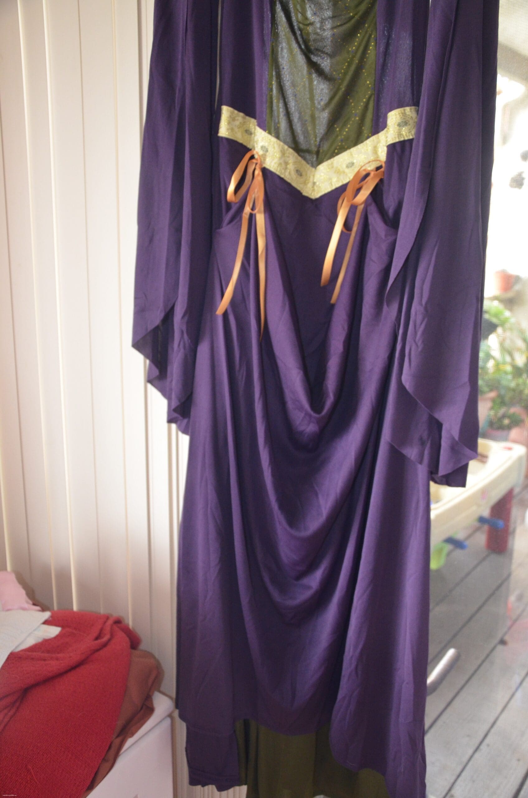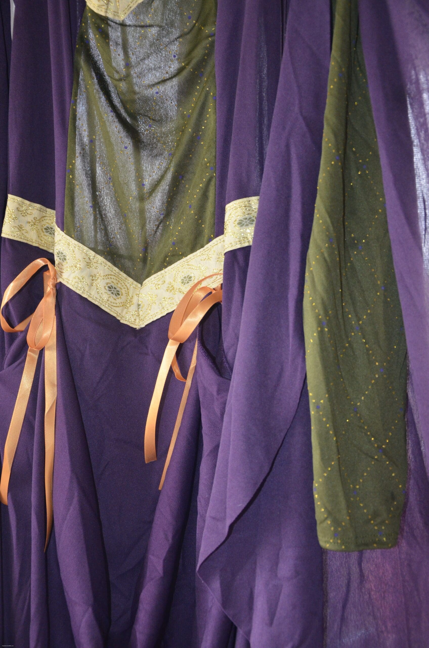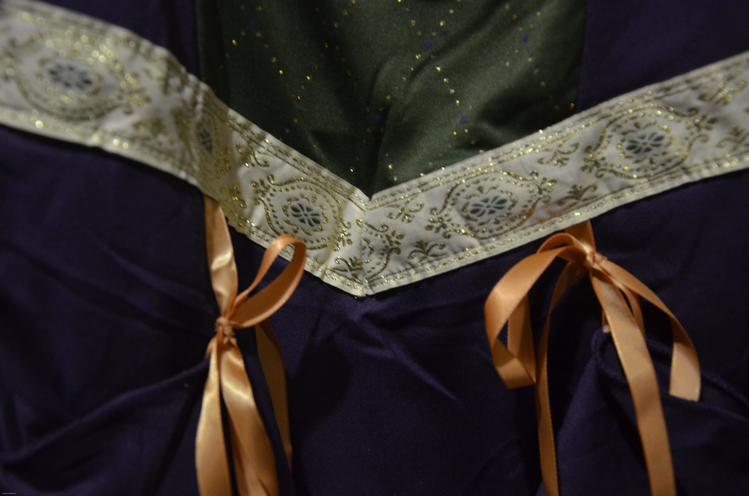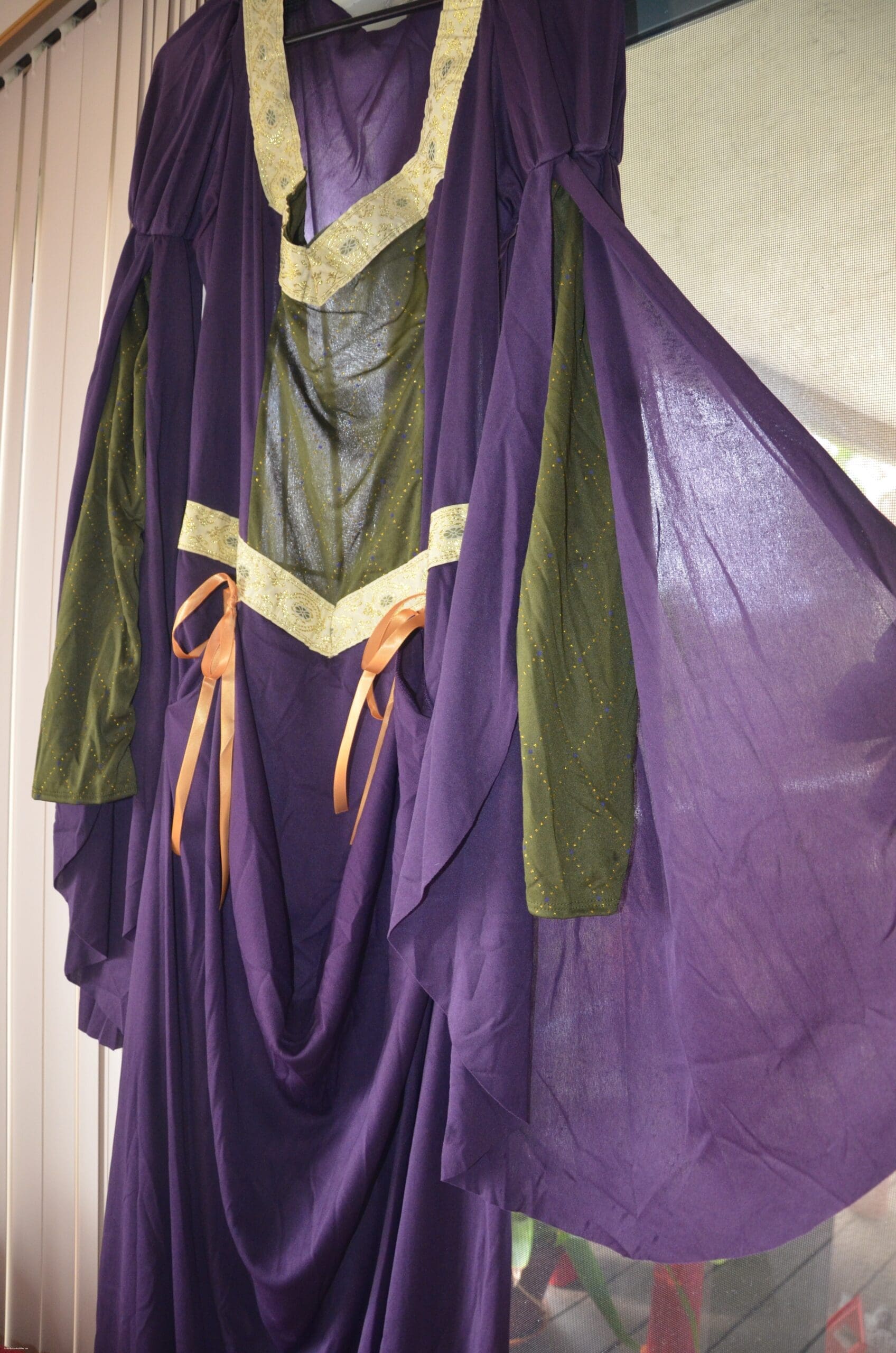 This Lady in Waiting costume is stunning! The details are so perfect! This can easily go to a Renaissance Fair, Halloween Party, Costume Party or dress up!! The Lady in Waiting Costume has details of a very expensive dress. The ribbons are beautifully done with embroidery. There is gold stitching in the sleeves. The dress has a faux underskirt. The colors are rich and vibrant. I LOVE this costume.