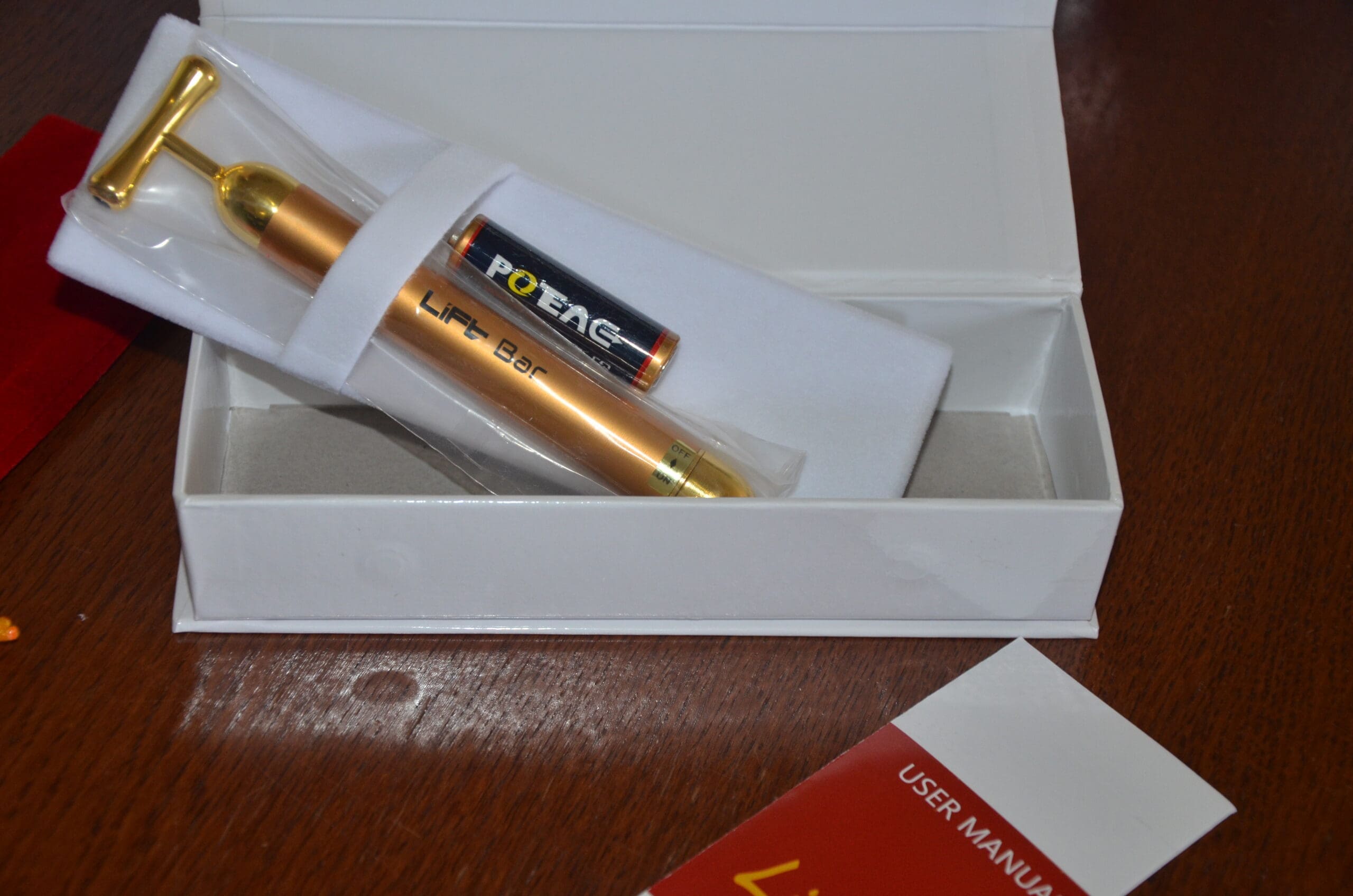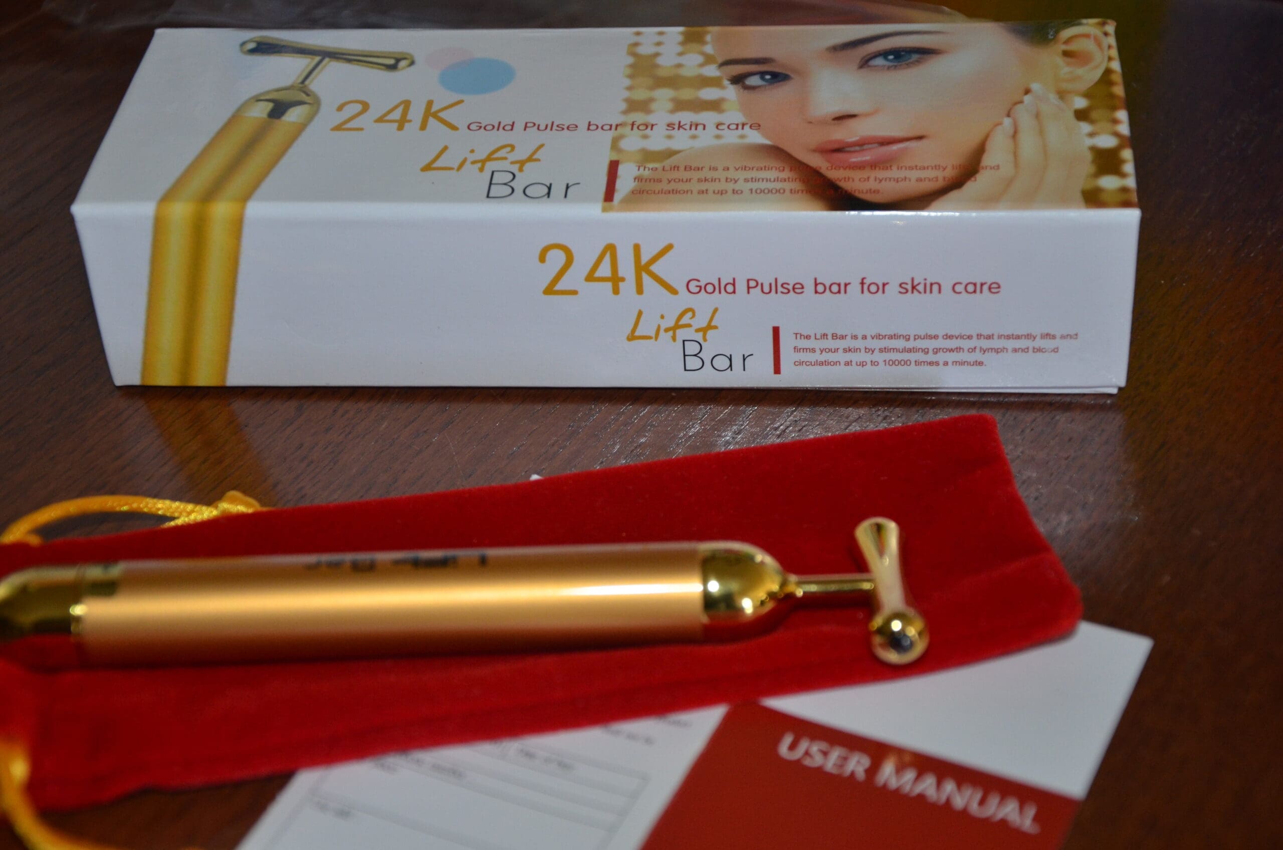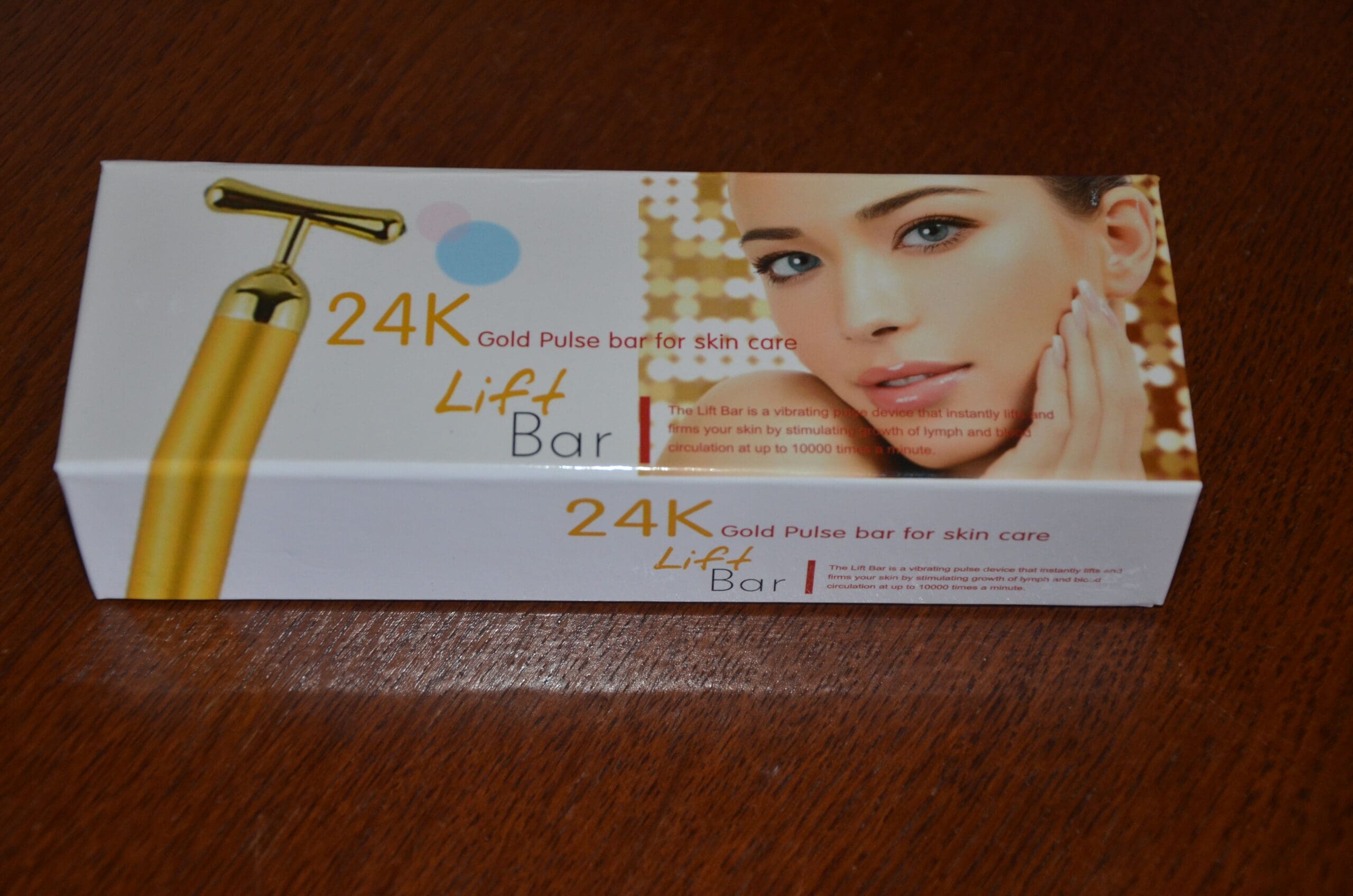I’m really excited about today’s review and giveaway!! This is the 24K Lift Bar. The Lift Bar is a battery operated wonder tool. The Lift Bar will lift sagging skin, make wrinkles disappear and rejuvenates your complexion all at the same time!! The Lift Tool sends 10,000 vibrations per minute to your skin. This is a FACE LIFT in your home!!
