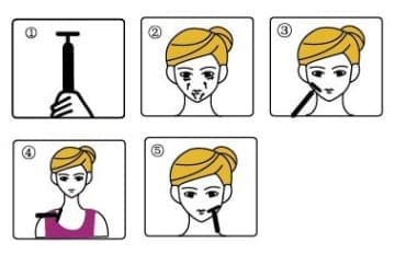 Massage the T-shape onto your face (2), move slowly up and down below your eyes and round your cheeks(3). Then maneuver down to your jaw and neckline (4) Spend about 15-20 secs per area.