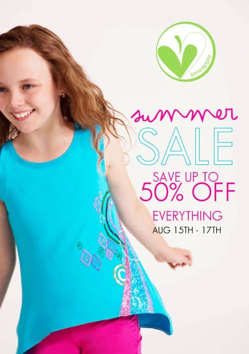 Summer SALE!!! How about 30 to 50% off of EVERYTHING sale?!?!  Limeapple, is a clothing site that empowers young girls with color, life and leading an active lifestyle. Bright, fun, colorful clothing for young girls, everything from active wear to swimwear and even everyday street wear .
