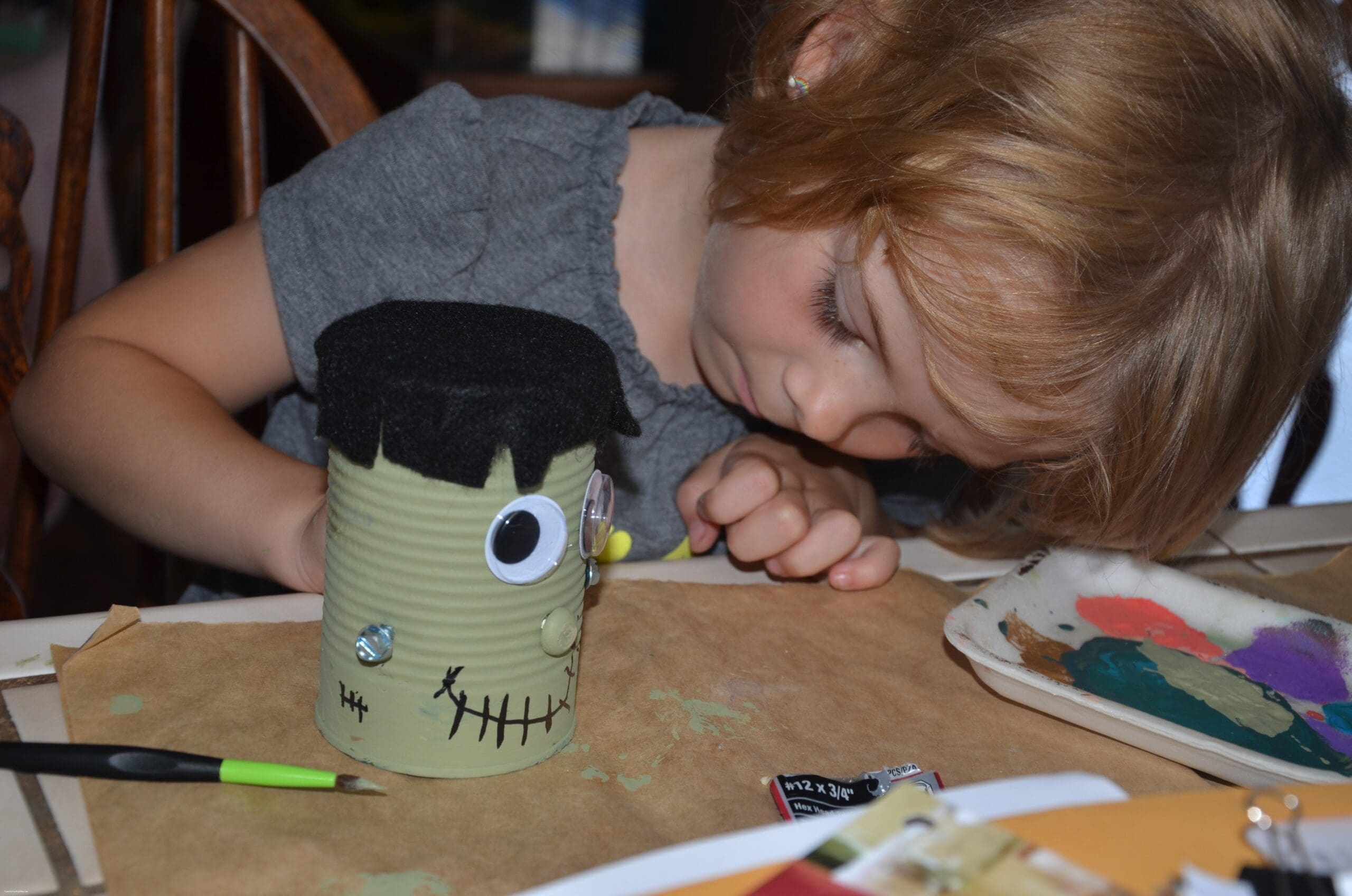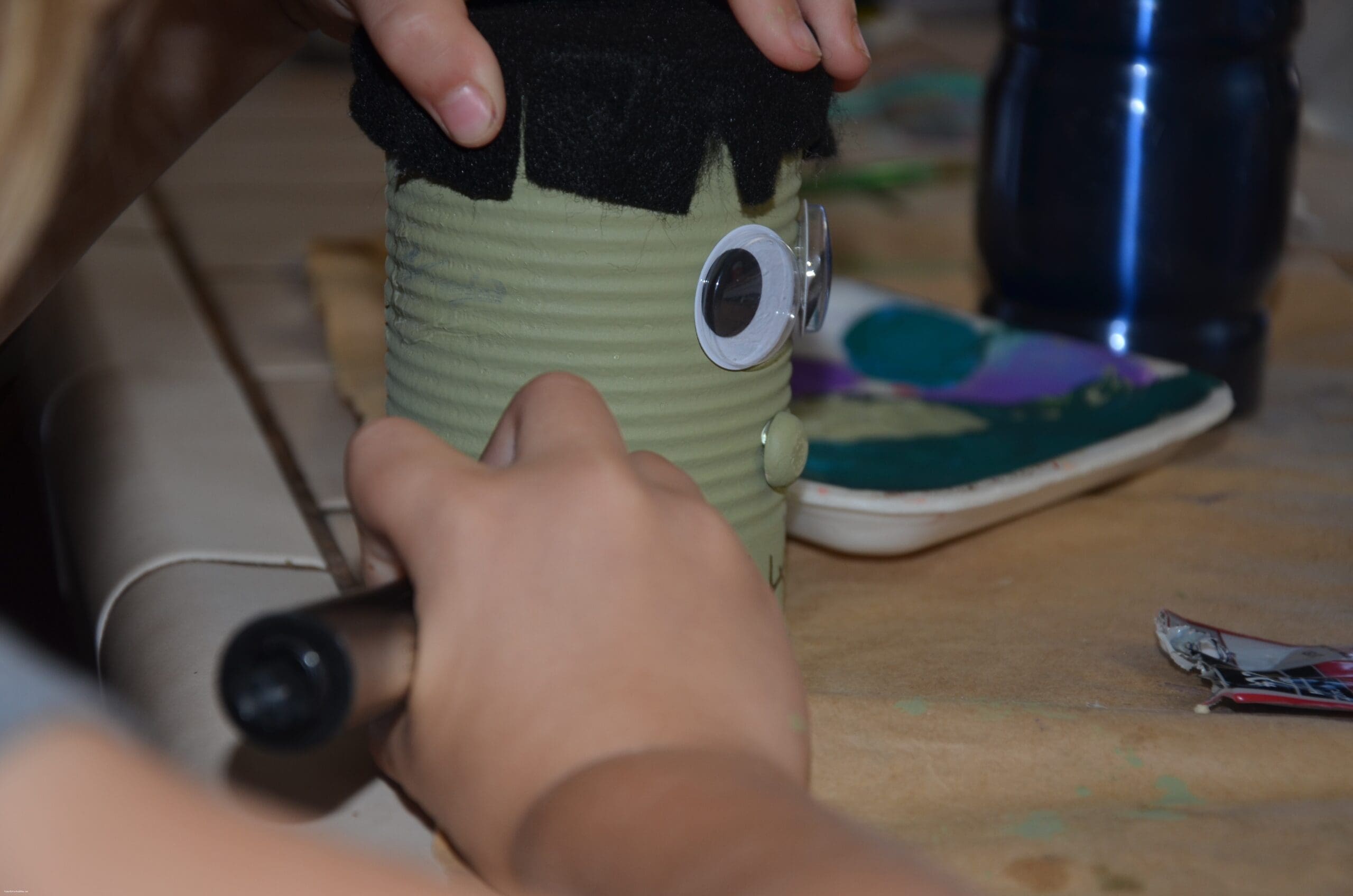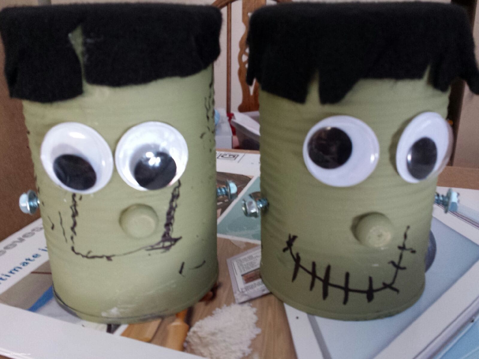 Green paint, 2 bolts or screws per can, googly eyes, black magic marker, glue, black felt, small round buttons or wooden dots for nose.