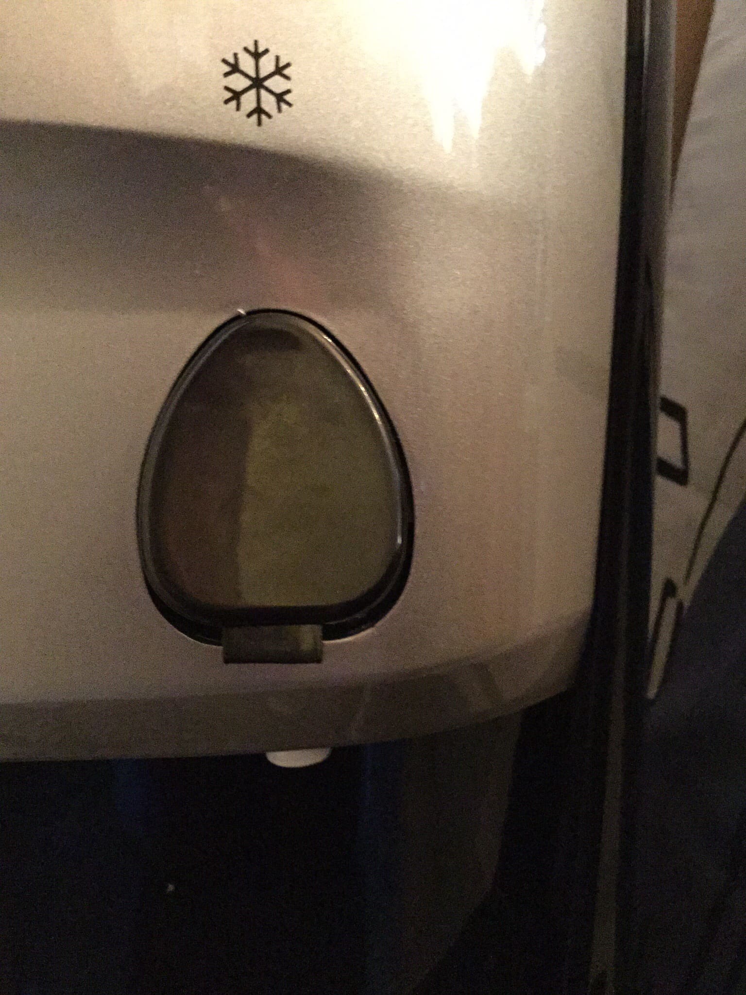 In order to get water you have to push the smaller button up into the larger button. Then depress the big button. Something a 3 year old can’t do! (okay, okay, she can’t do it YET!) I apologize for how dark this video is, the corner in the diningroom doesn’t have a lot of light. I just want you to get an idea of how easy it is to use the childproof button.