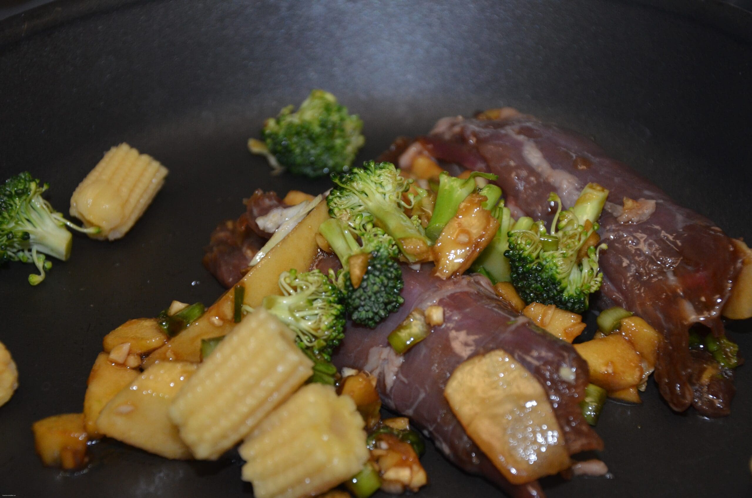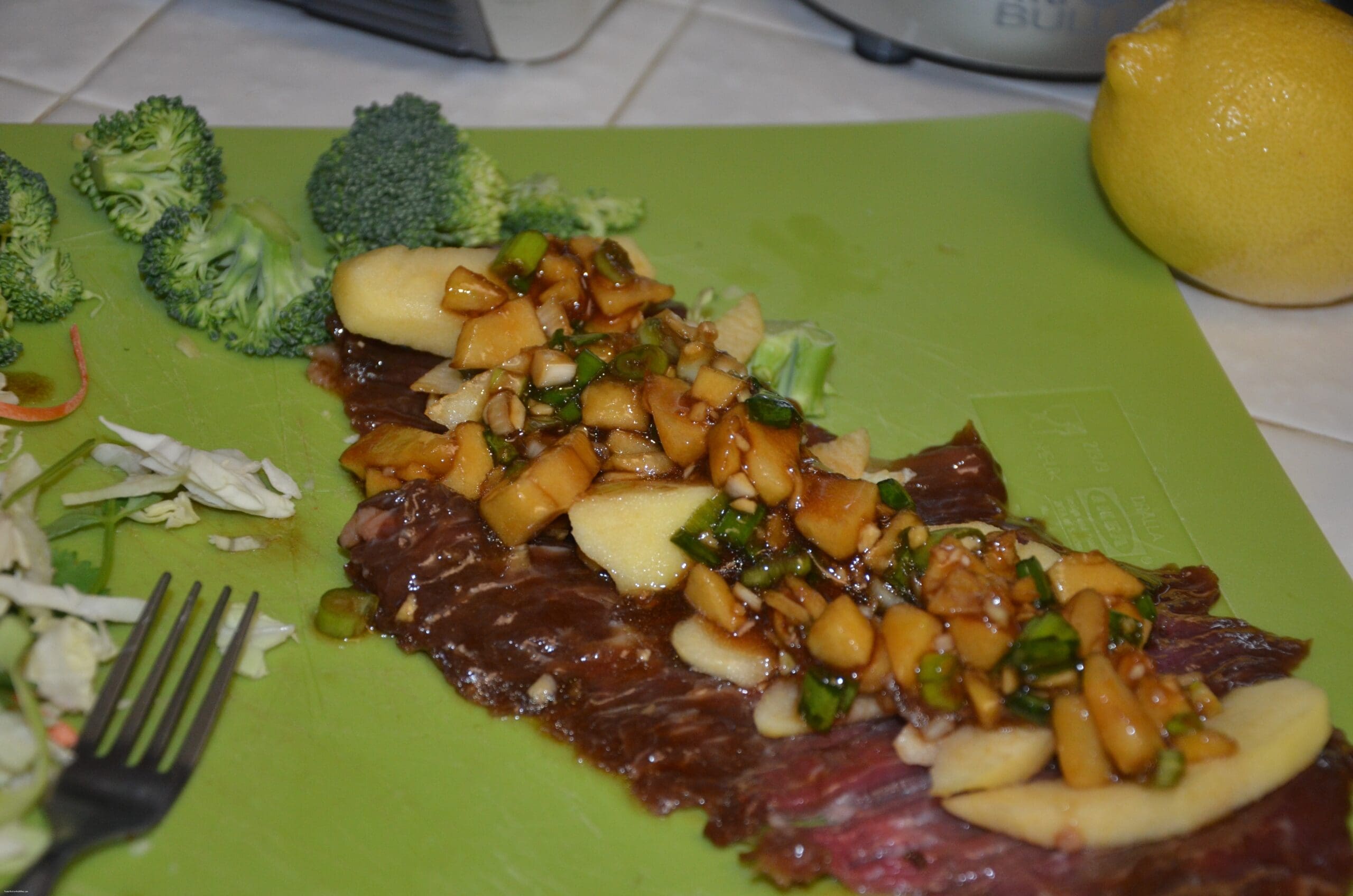 Lay the flank steak out and add sliced apple, broccoli, mushrooms and the remaining marinade. Gently roll the flank steak. Hold with toothpick. Seer each side. Add more broccoli at the last few minutes to bring out the bright green color.