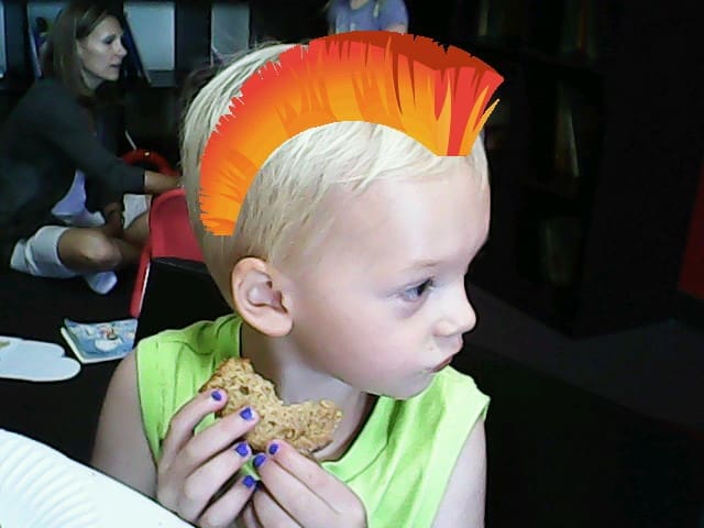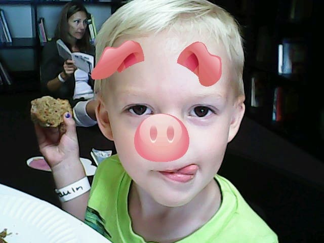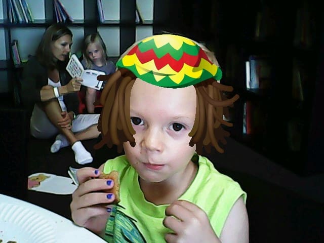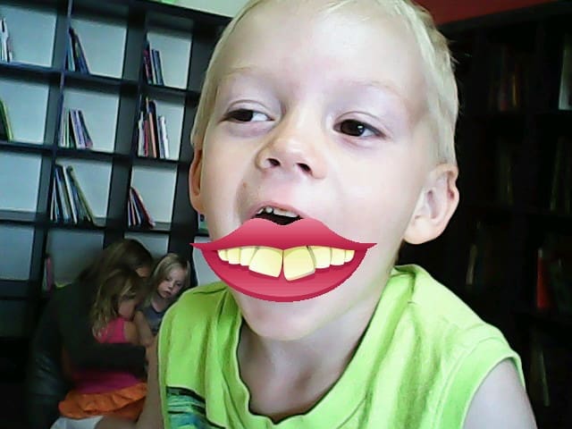 Eli is holding the ShowCam for me here, see the bright green lever? In that position ShowCam is a projector. The lever is up and you’re kids are taking digital pictures.