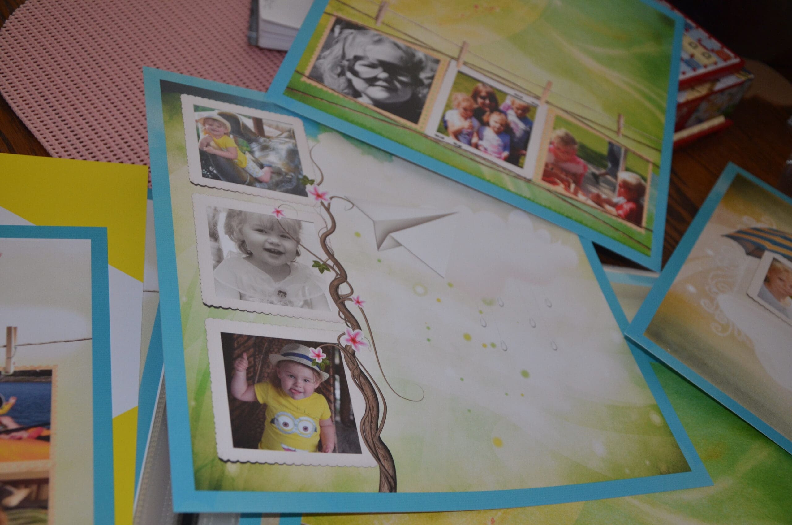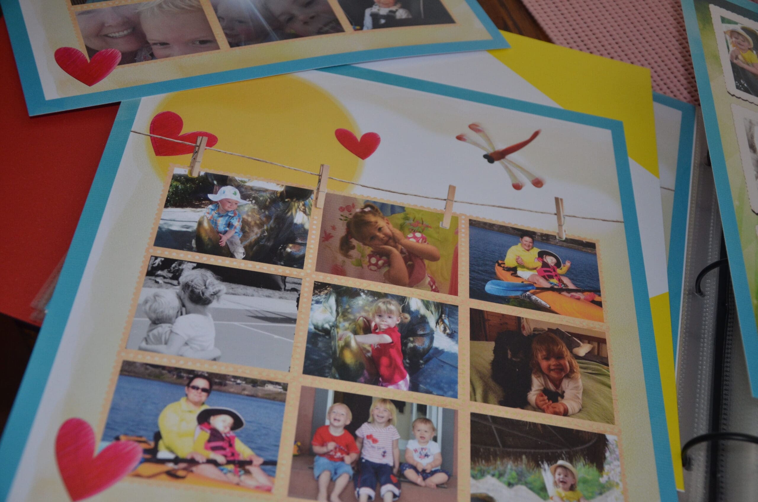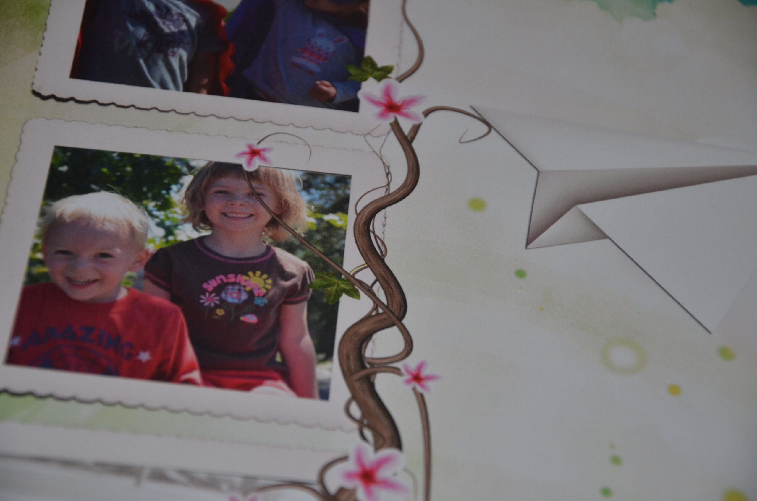 I found pages décorated in beautiful greens and just screamed SUMMER to me. This paper has everything I would put on a page if I was to design it myself. Dragon flies, hearts, vines, flowers. All of it! All the way to the paper which is a heavy premium paper with a light gloss finish. I arranged the photo’s I wanted on my pages and cropped them the way I wanted too.
