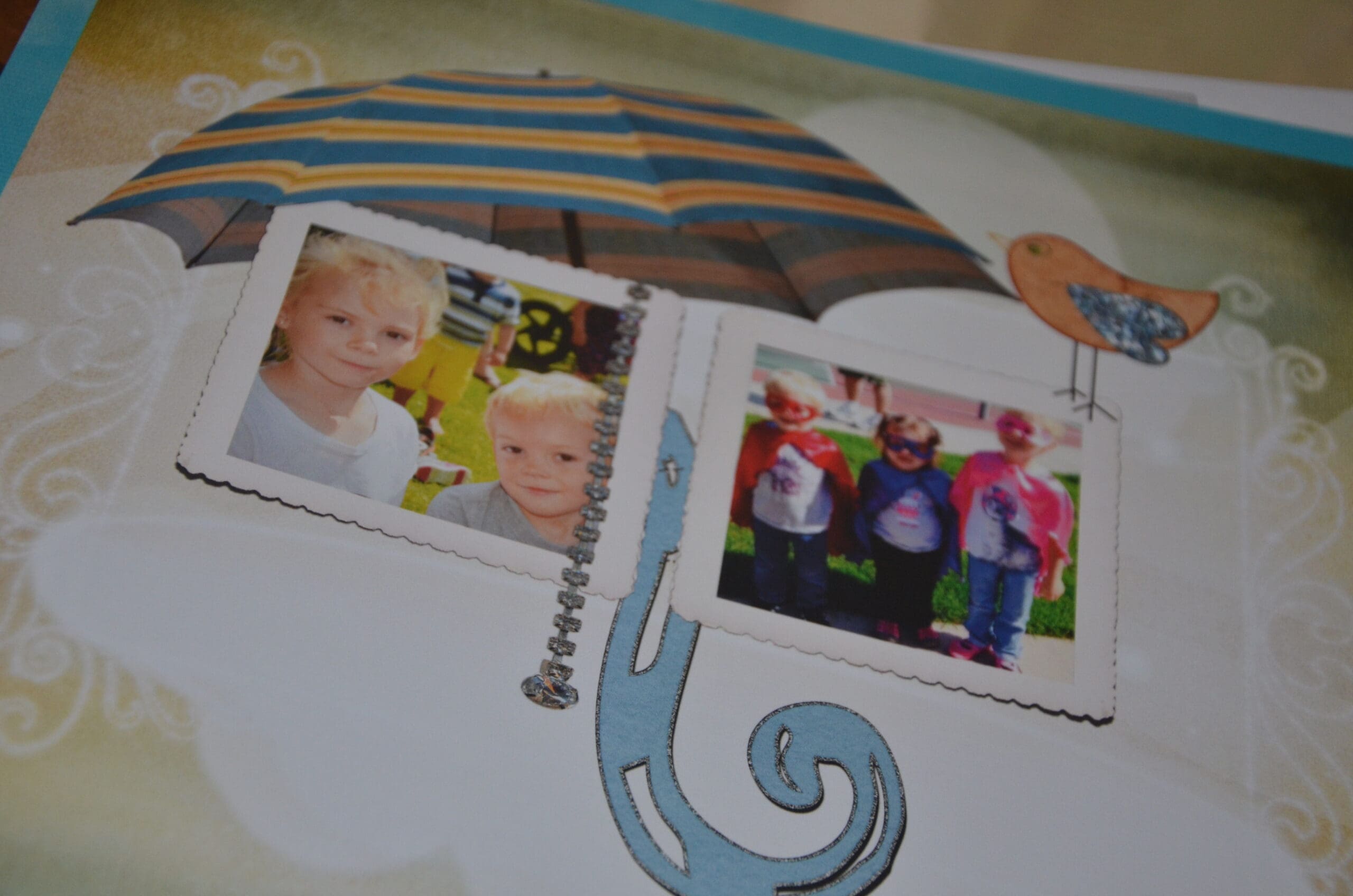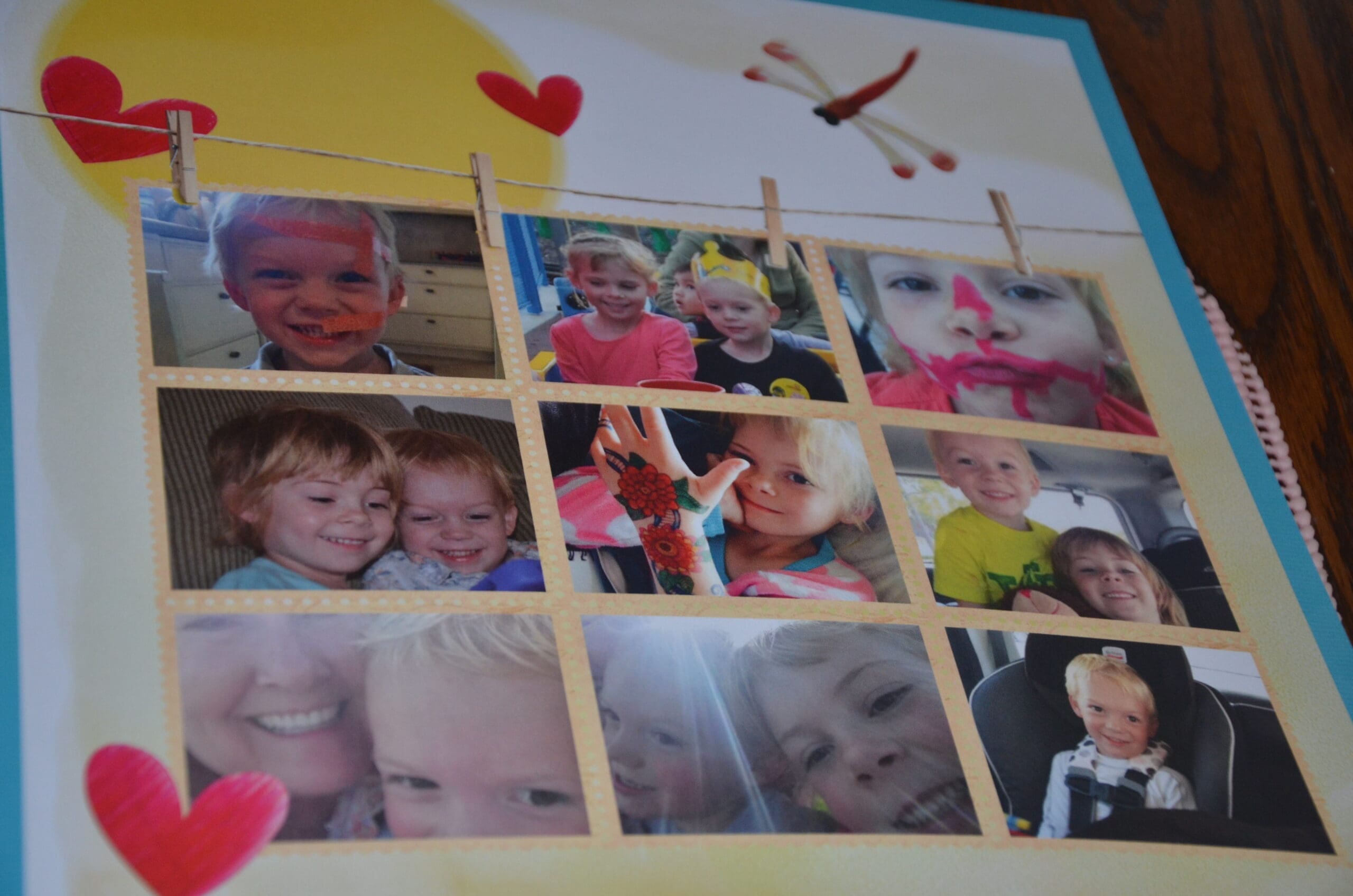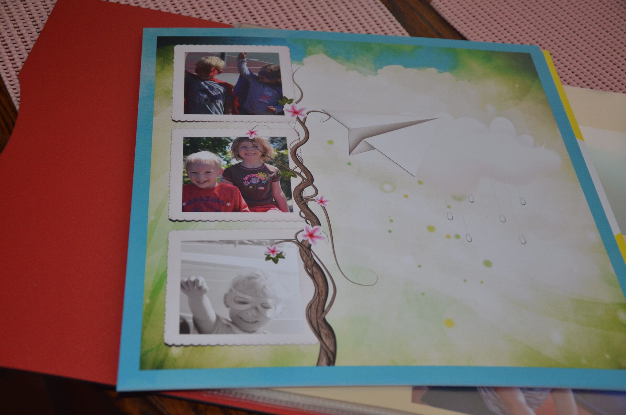 I found pages décorated in beautiful greens and just screamed SUMMER to me. This paper has everything I would put on a page if I was to design it myself. Dragon flies, hearts, vines, flowers. All of it! All the way to the paper which is a heavy premium paper with a light gloss finish. I arranged the photo’s I wanted on my pages and cropped them the way I wanted too.