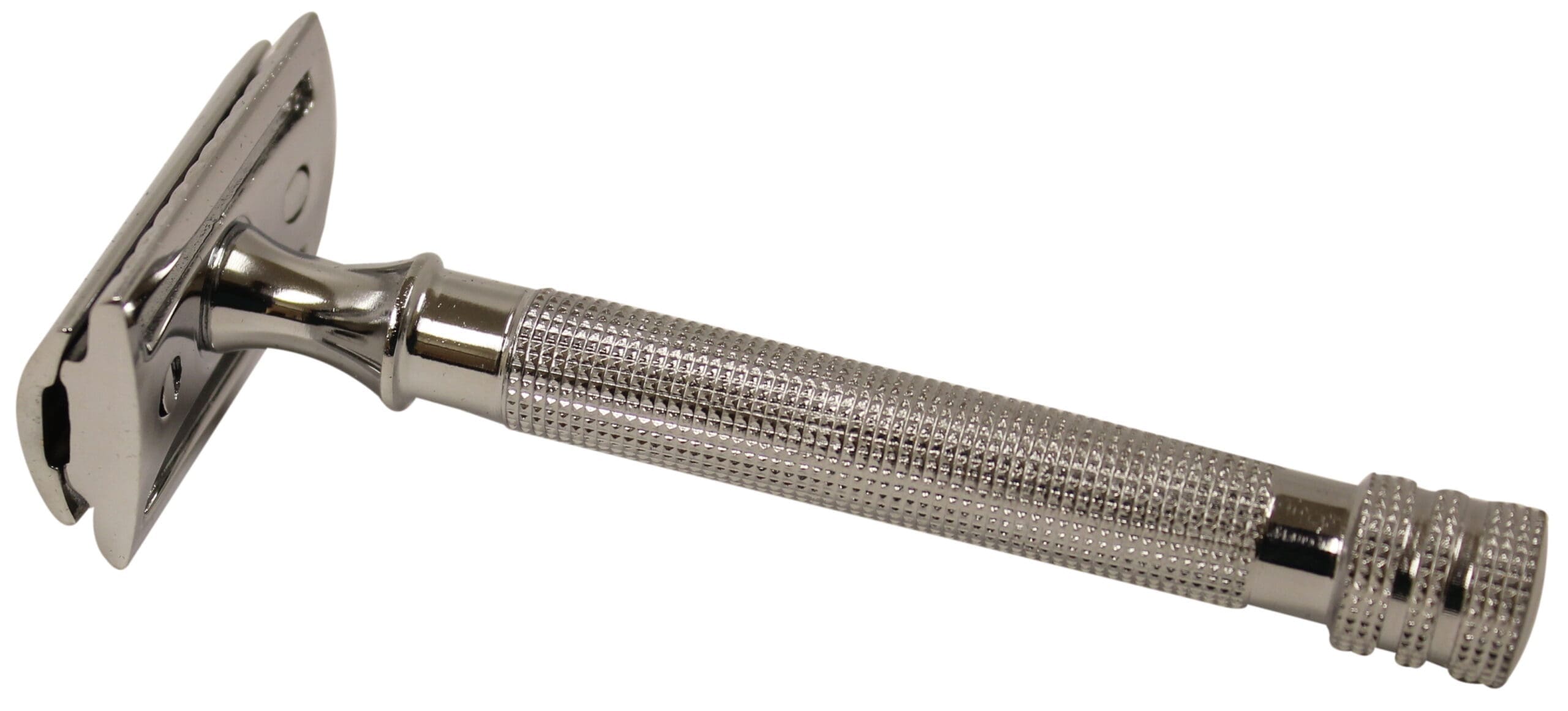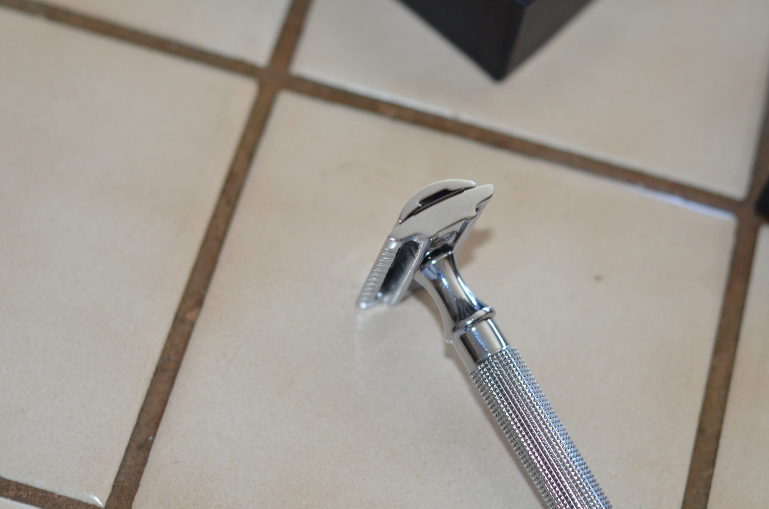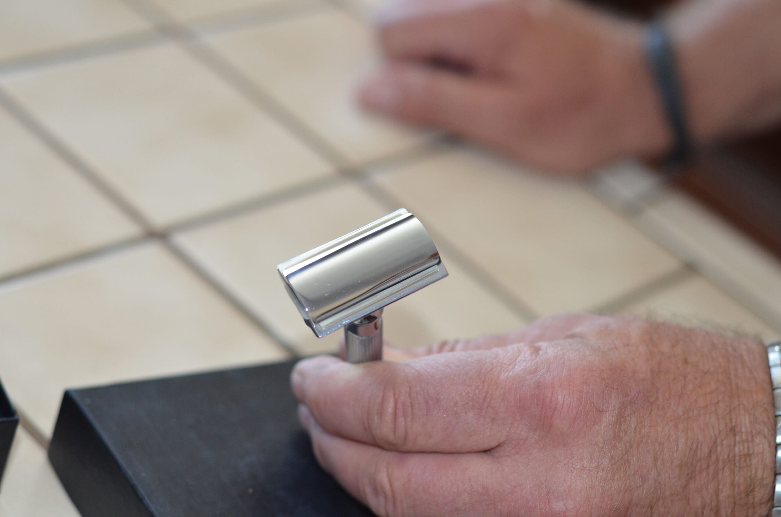 This is a beautiful, solid stainless steel safety razor with chrome finish. This razor has a long handle and fits comfortably in my hand and equally as comfortable in DH’s hand.