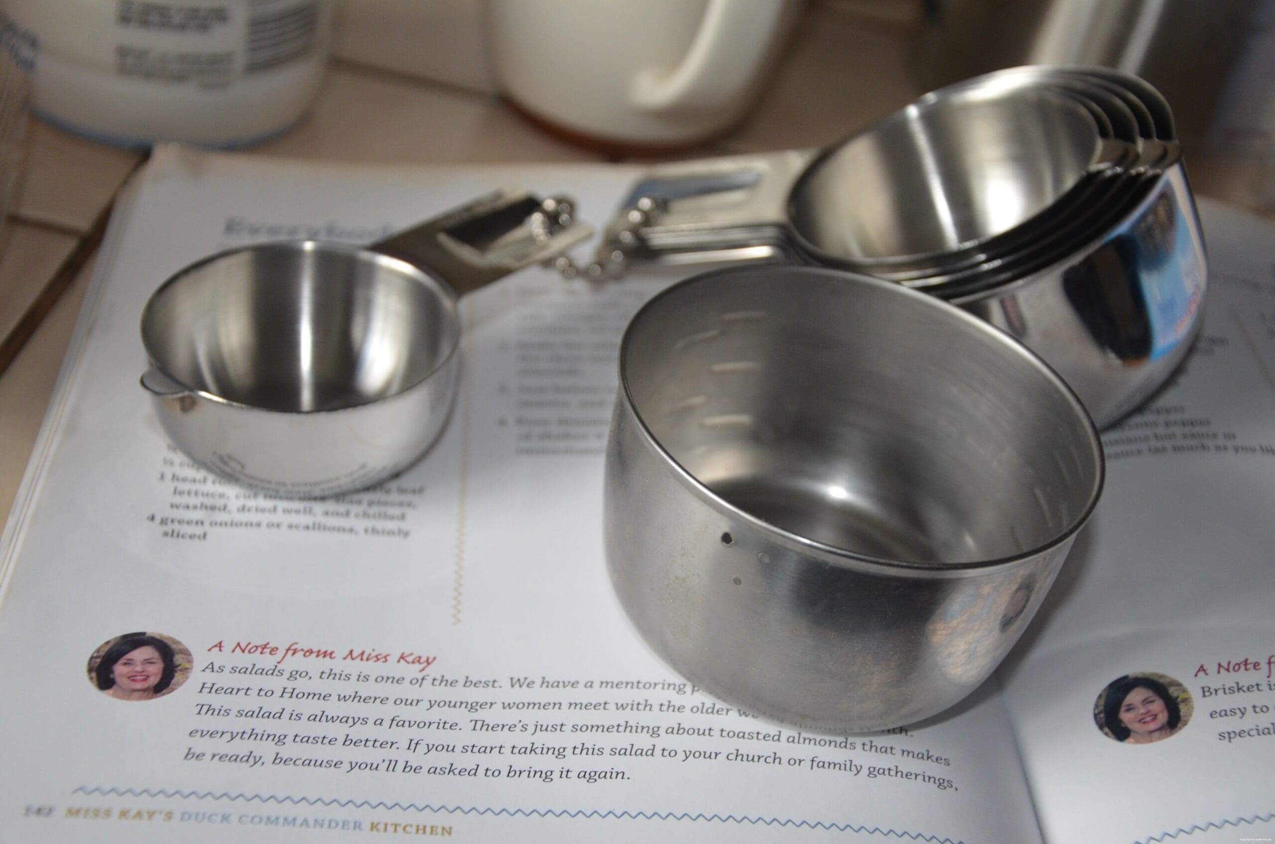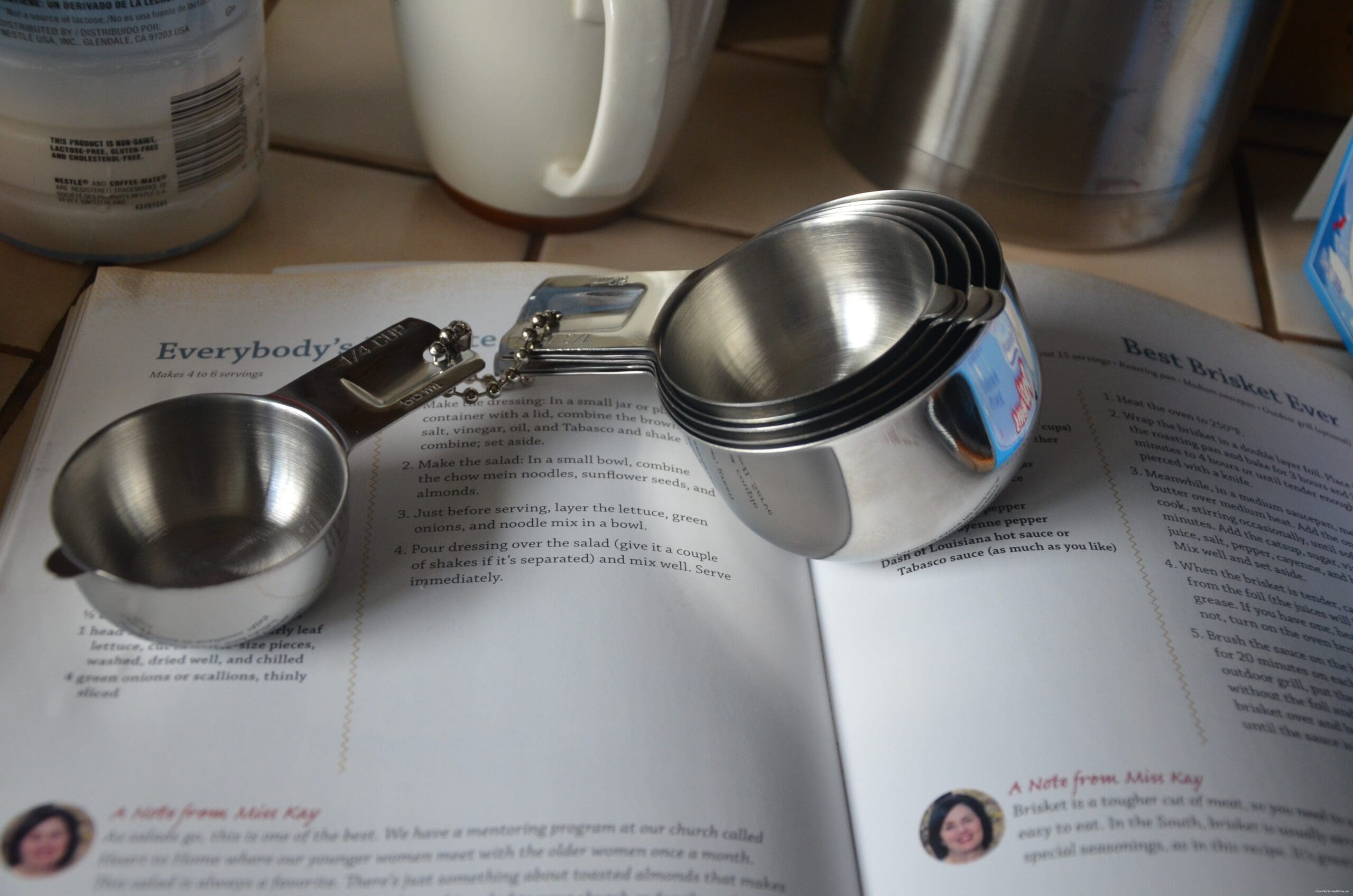 I can’t remember when or even where this battered and beat up measuring cup came from, it’s been around forever. I mean yes, there is a hole on the side so if you are measuring liquid… measure fast!! But, it still measured stuff… sort of. When my new set arrived, I couldn’t get that measuring up into the trash fast enough!! My kitchen is now sporting the Bellemain Stainless Steel Measuring Cup set. Yes, REAL HEAVY-DUTY stainless steel!! These are heavy cups!! 6 cups in total you can keep them all together with chain link that comes with it. The handles are wide and so easy to grip. Each of the cups are engraved with the measurements. Engraved means the measurements aren’t going to wash off or wear away!!