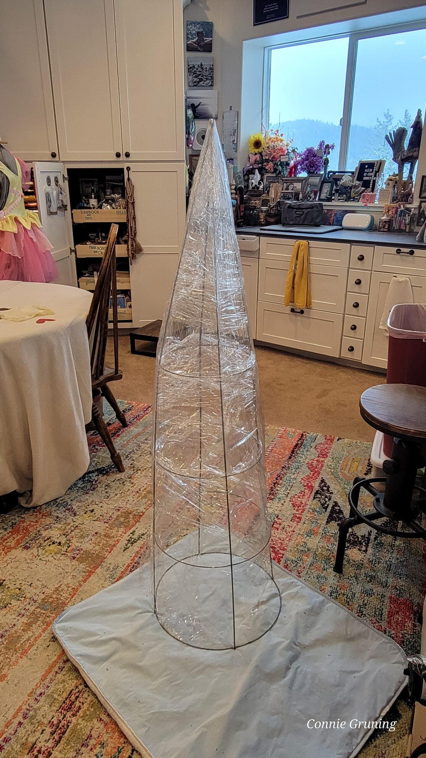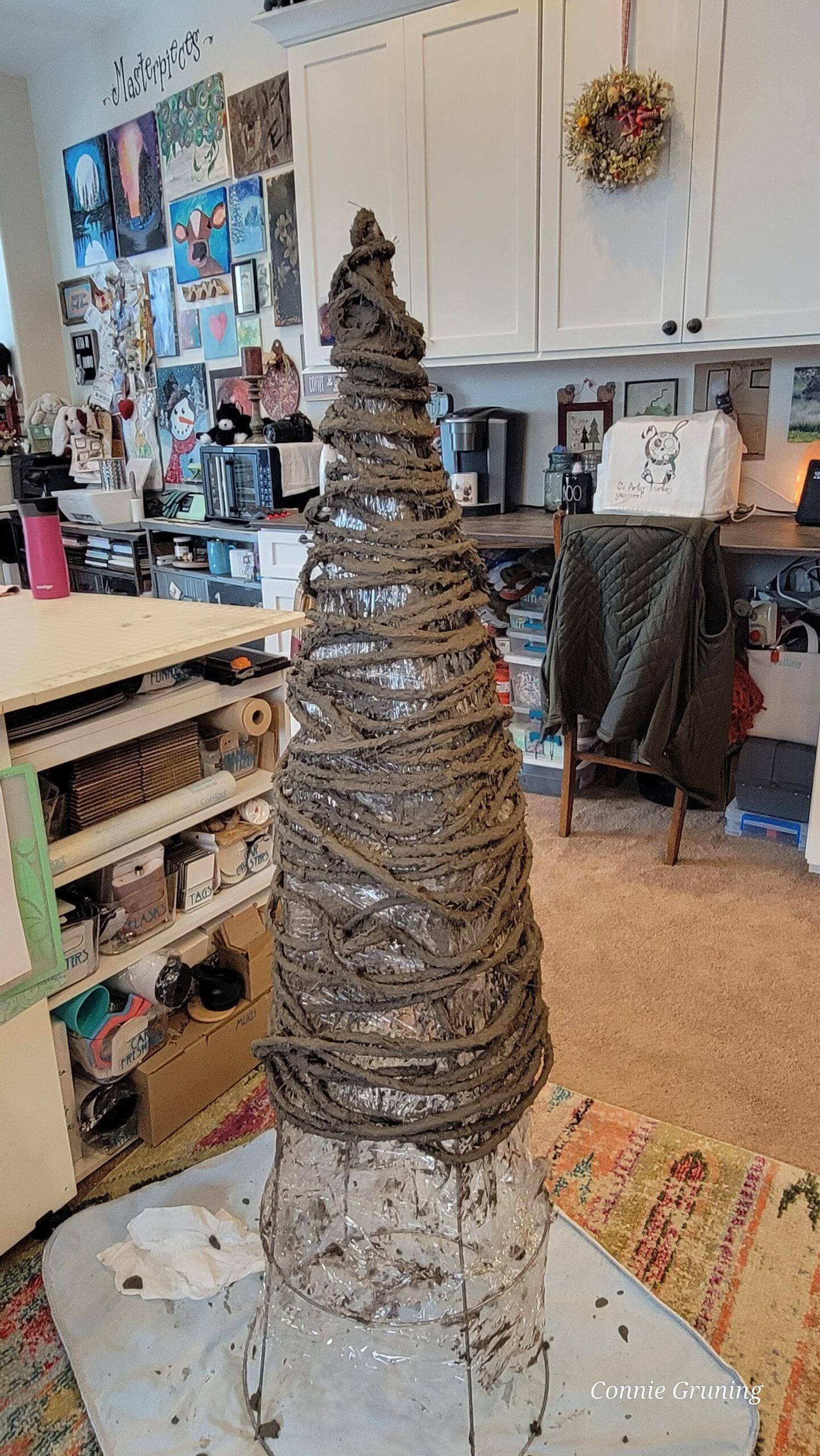 I wanted to do something along those same lines. SO!!! How about a concrete Christmas Tree?!?!?! The Husband grabbed me two rolls of large 3/8″ inch manila rope.  I have a huge tomato cage just sittin’ around waiting for next year……. so I covered it with saran wrap, mixed up concrete, submerged the rope in in the concrete mixture and started wrapping the tomato cage.  I’m so pleased with the look!! The rope looks a lot like twigs or branches. (LIGHT BULB!! Next year LET’S make one of BRANCHES!! Ya know cause The Mountain in Idaho doesn’t have enough trees so I have to make ones out of cement and branches. Don’t JUDGE ME!! I MUST to do what the voices in my head tell me to do).